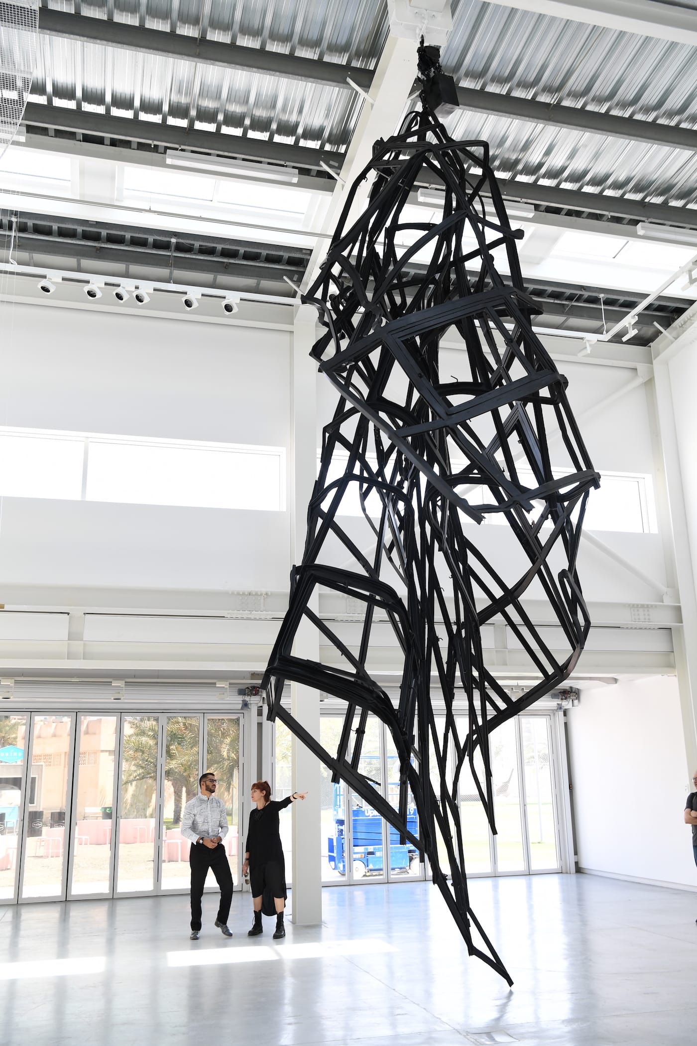 Animal, human, mineral, and the passage of time come together beautifully in an inspired install that juxtaposes Mariana Castillo Deball’s “Hypothesis of a Tree” (2016) with Monika Sosnowska’s “Façade” (2013) on the lower floor and Marwan Rechmaoui’s “Blue Building” (2015) on the mezzanine of one of the main SAF spaces in Al Mureijah Square. Deball’s sprawling installation consists of rhizomatic bamboo structures that resemble an evolutionary tree diagram. They delicately hold paper rubbings of fossils, bringing together not only the notation of biological time, but also its imprint. The piece dialogues well with Sosnowska’s seven-meter steel sculpture, black and drooping from the ceiling. It has in fact been modeled from a modernist building maquette but looks organic, pliable, and soft. Architecture and genetics: Both Sosnowska and Deball offer deconstructed building blocks for the ways nature and cityscapes may be constructed and engineered.