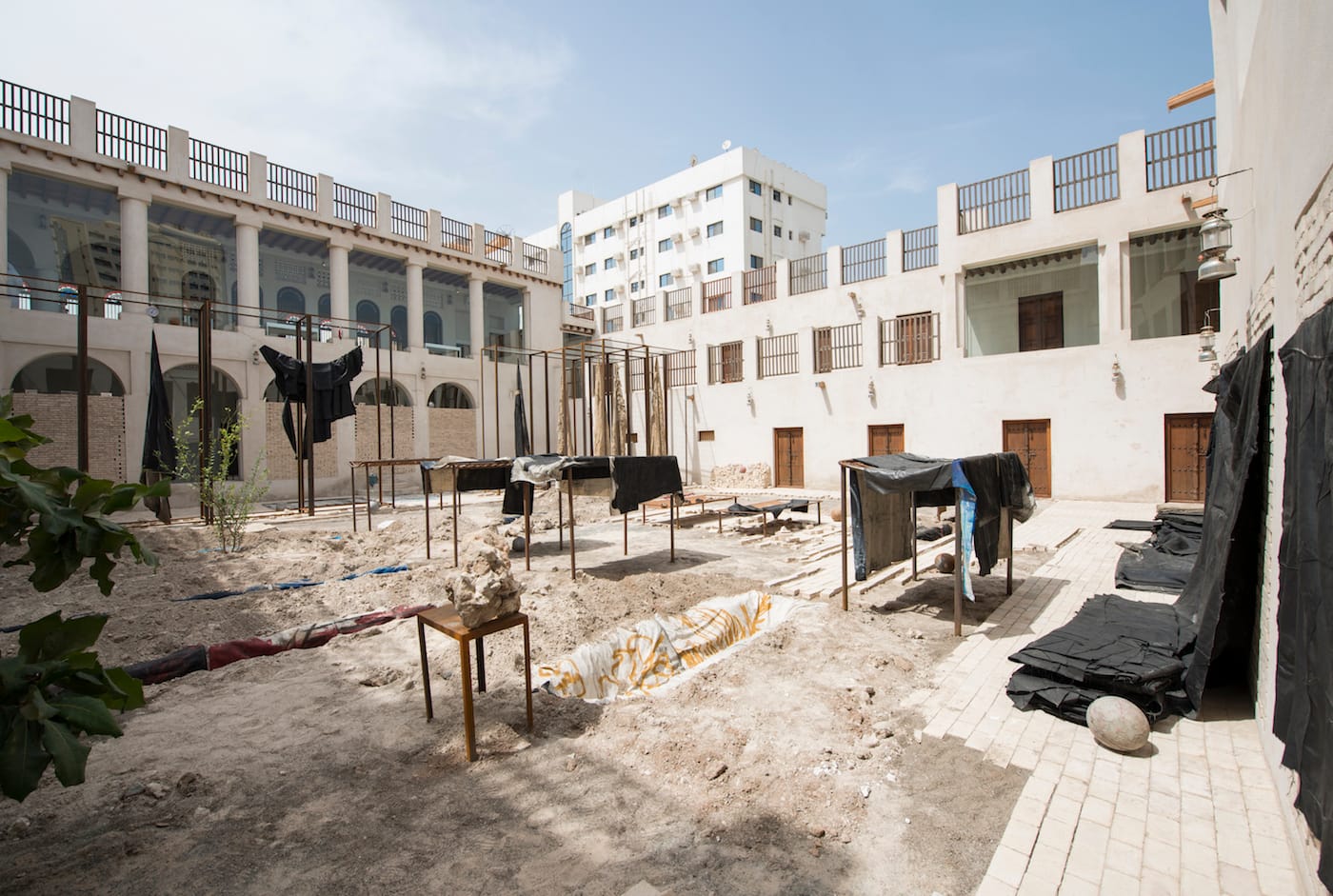 Back in Sharjah, in Bait Al Serkal, a 19th-century heritage building and one of the main venues for SB13, Oscar Murillo has, for his site-specific installation Condiciones aún por titular (Conditions not yet known) (2014–17), ripped out the courtyard’s pavement stones and placed them in the windows, blocking the view. It’s an interesting take on the politics of looking: You are forced to either enter the site or see it from the top floor. Dug trenches are lined with colored fabric and there are half-painted canvases on the floor, draped on rusty mortuary beds, and hung from rusty scaffolding as if they were trophies or perhaps cadavers. Together they puncture the broken space in which time, but also labor, seem discontinued. Are we witnessing a construction site, a forensic crime scene, or an archaeological dig? Murillo’s violent undoing of this particular heritage site could be seen as a bold move in the UAE, which is pouring significant resources into constructing its cityscapes at a dizzying pace and with dubious labor conditions, but at the same time is investing in museological heritage projects that tell narratives of national history and identity. There is something disconcerting yet attractive about Murillo’s installation, and however we look at it — from within the scene or from above — the complicity of our gaze is haunting. There’s a fine line to walk between creation and destruction, just as there’s a fine line between ruin and spectacle, and Murillo walks it well.