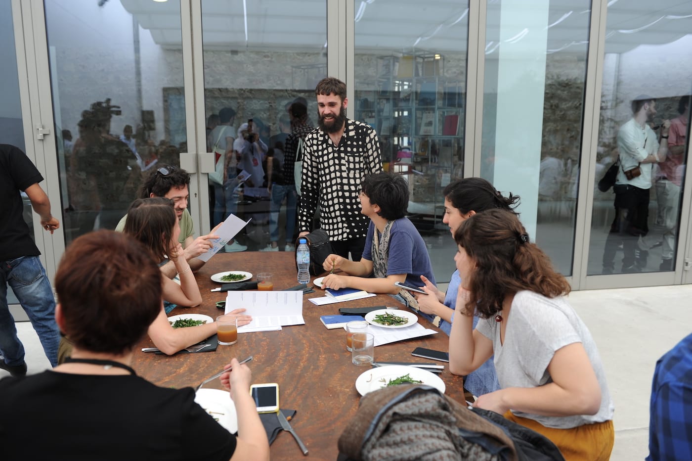 Ecological survival and plant ingenuity was on the menu of the performative climavore lunch by London-based duo Cooking Sections (Daniel Fernández Pascual and Alon Schwabe). Befitting the landscape of the UAE, desertification, aridity, and salinity inspired the six-course meal that was shared among biennial attendees on tables carved out like desertification patterns. I would not order a serving of the moss-tasting moringa leaf cake again, no matter its anti-desertification qualities (it made my mouth go appropriately dry), but the fried cassava (a so-called “insurance crop” that grows and keeps under challenging conditions) served with a garlicky desert truffle and chickpea mayonnaise was a winner. For Cooking Sections, food is a tool to critically explore how we are, quite literally, consuming our planet. By bringing people together to eat, they remind us that, differences aside, we all bear responsibility for the sapping of our environment.
