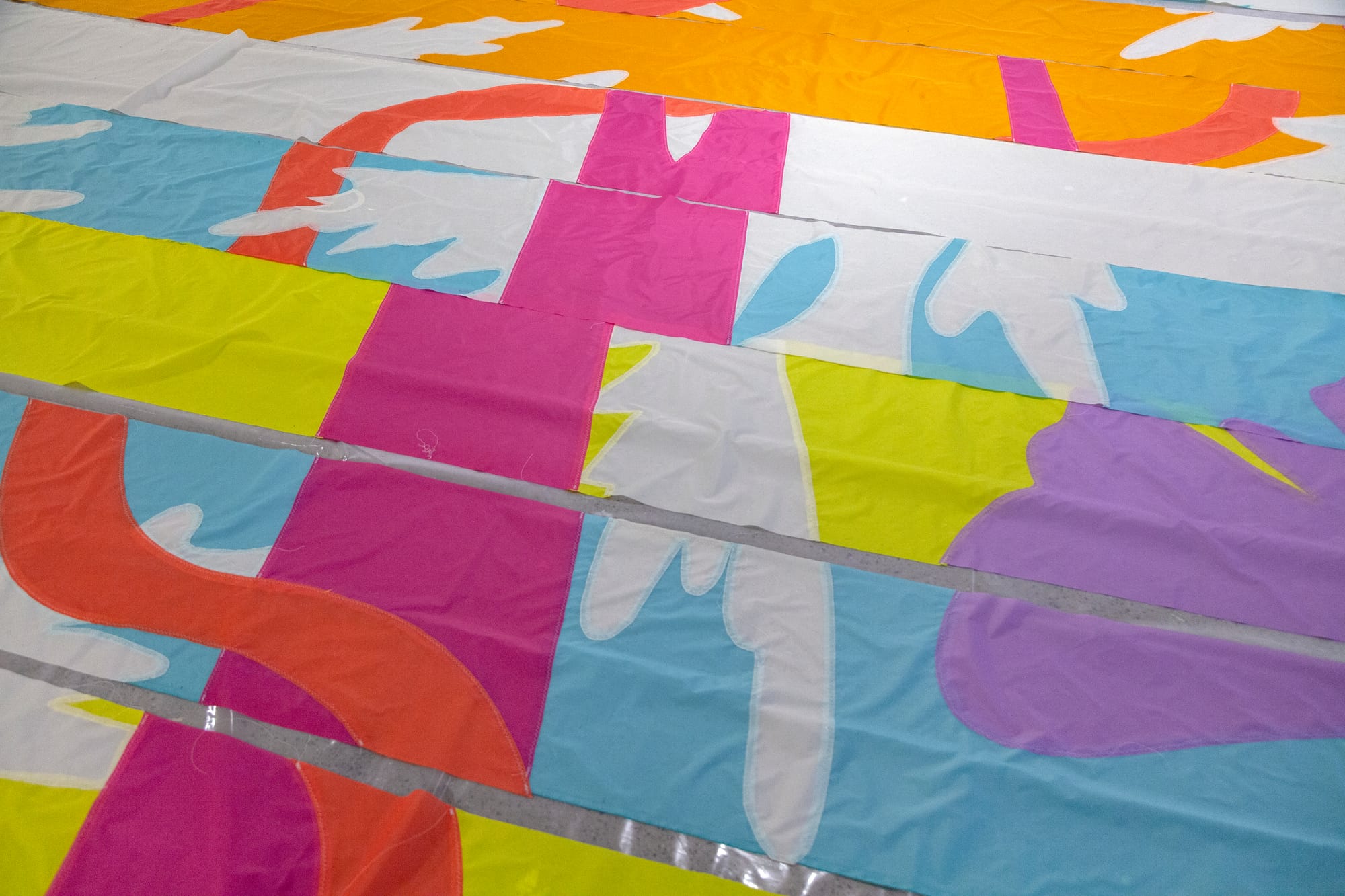 Over two centuries later, Fells’s remains were discovered in the Schuylkill River, which intersects with the Delaware River in Philadelphia. In images published online, Fells is shown wearing bright yellows, pinks, purples, and blues, and donning signature burgundy hair. Sail Through This to That draws upon this same color palette in abstract, disjointed forms within the textile.