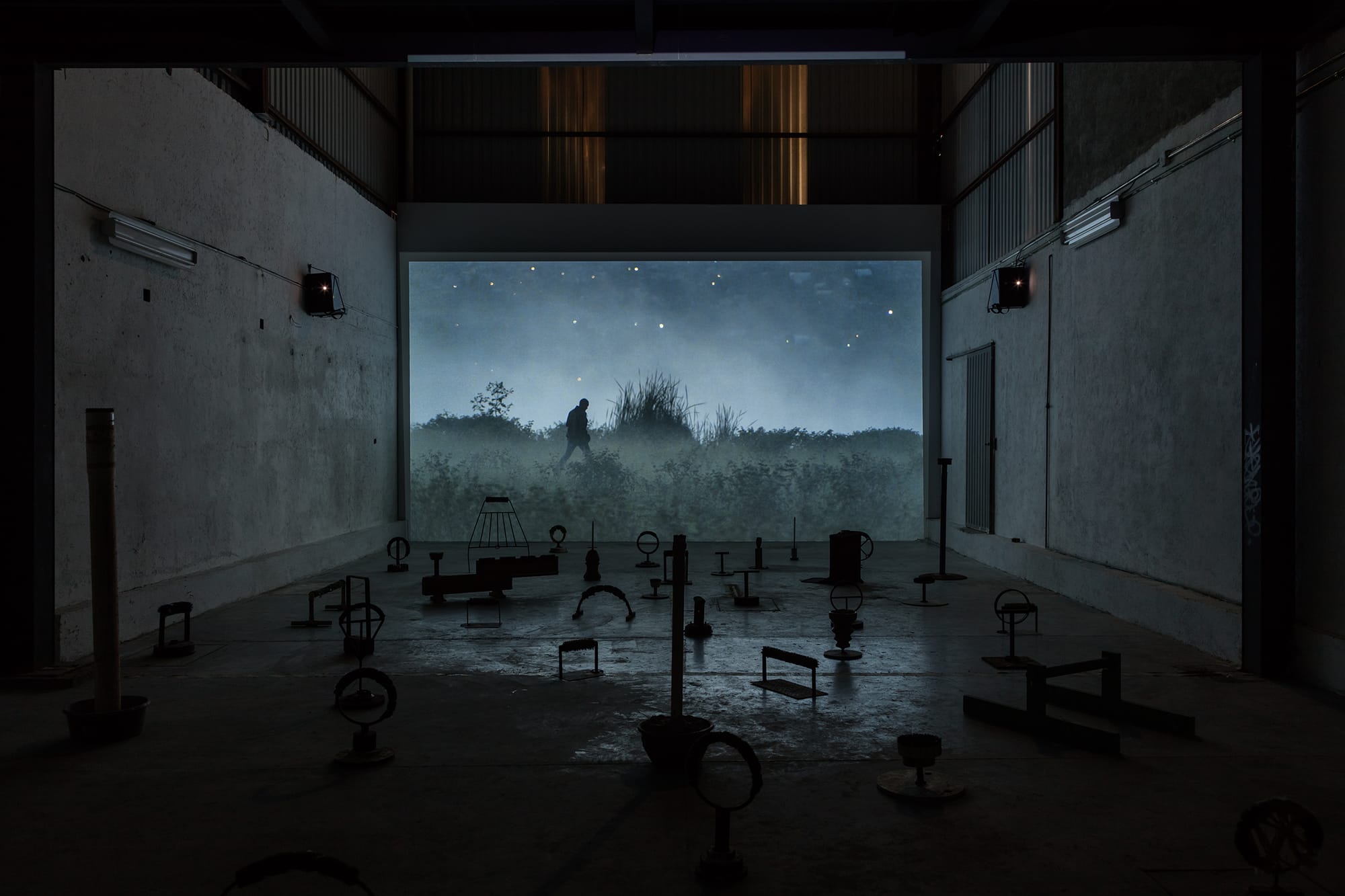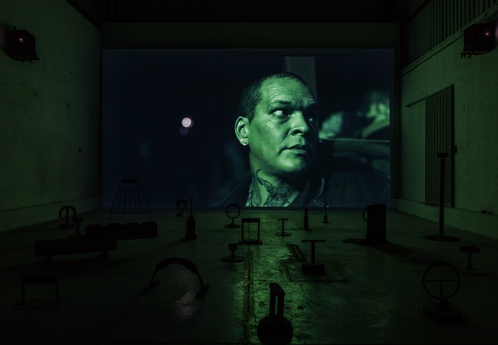 The video switches between scenes at the nightclub where Camaleón works as a bouncer, looming over the crowd, expelling belligerent drunks by their belts, to Camaleón cruising the city on his moped, weaving between Mexico City traffic, to his dungeon-like apartment where grime drips down the walls, and to the outskirts of the city where he brings his falcon to hunt in misty grasslands. He never speaks directly the the camera, but his disembodied voice is edited into the composition, recounting ambiguous anecdotes of a life in the moonlit underworld — a life outside of regulated society. Inside the exhibition, sounds of passing airplanes and traffic permeate the space, making the viewer ever aware of the monstrous city rumbling outside.
