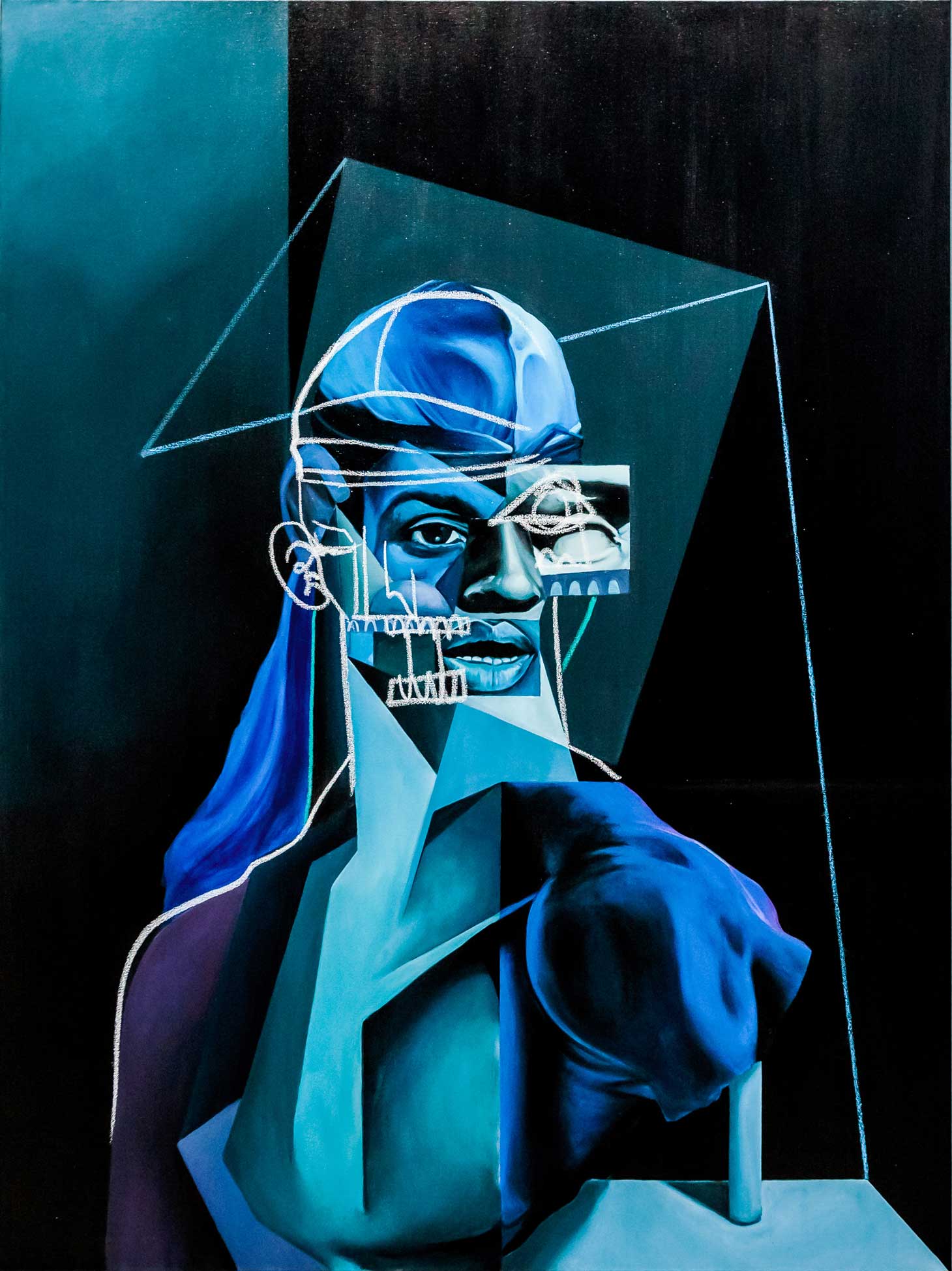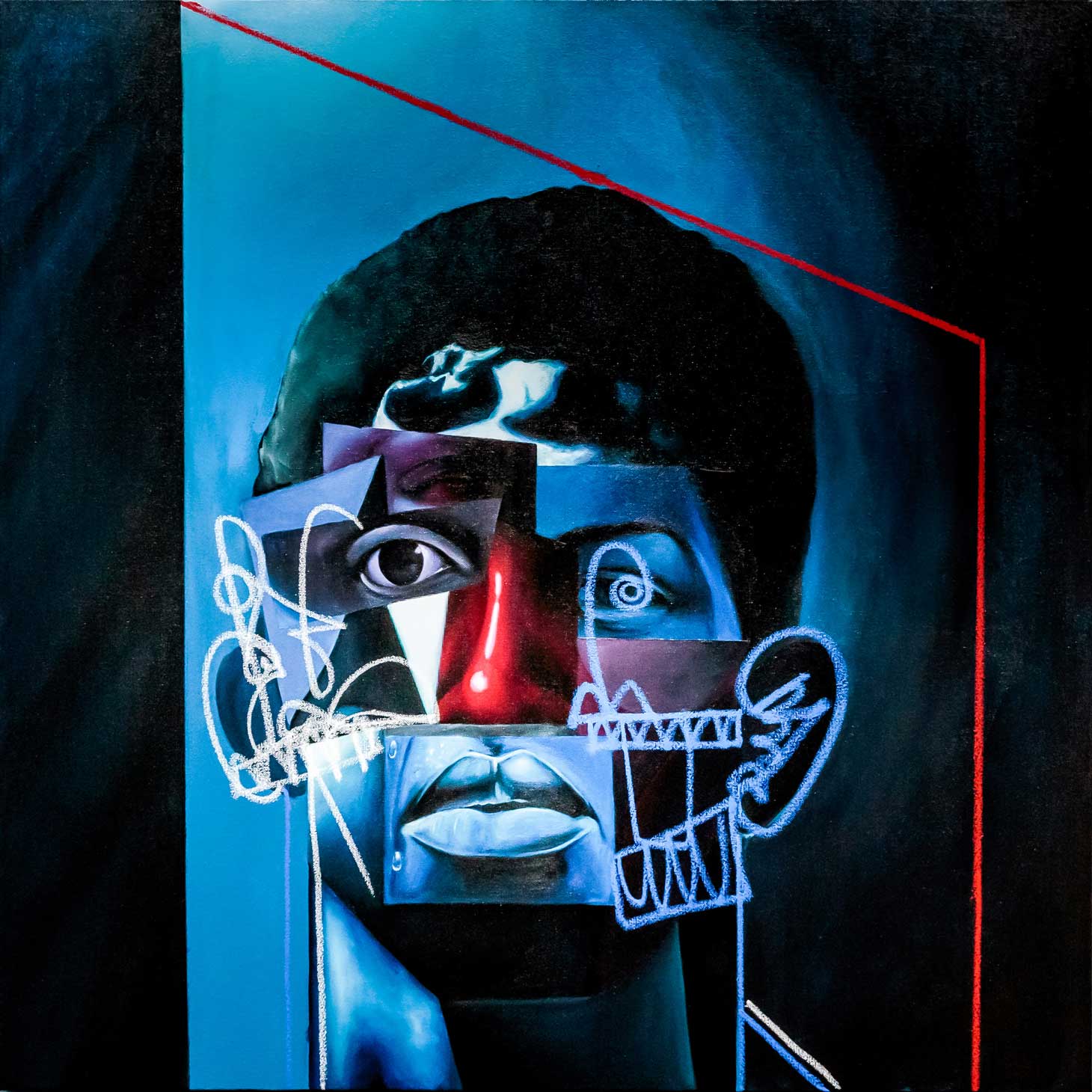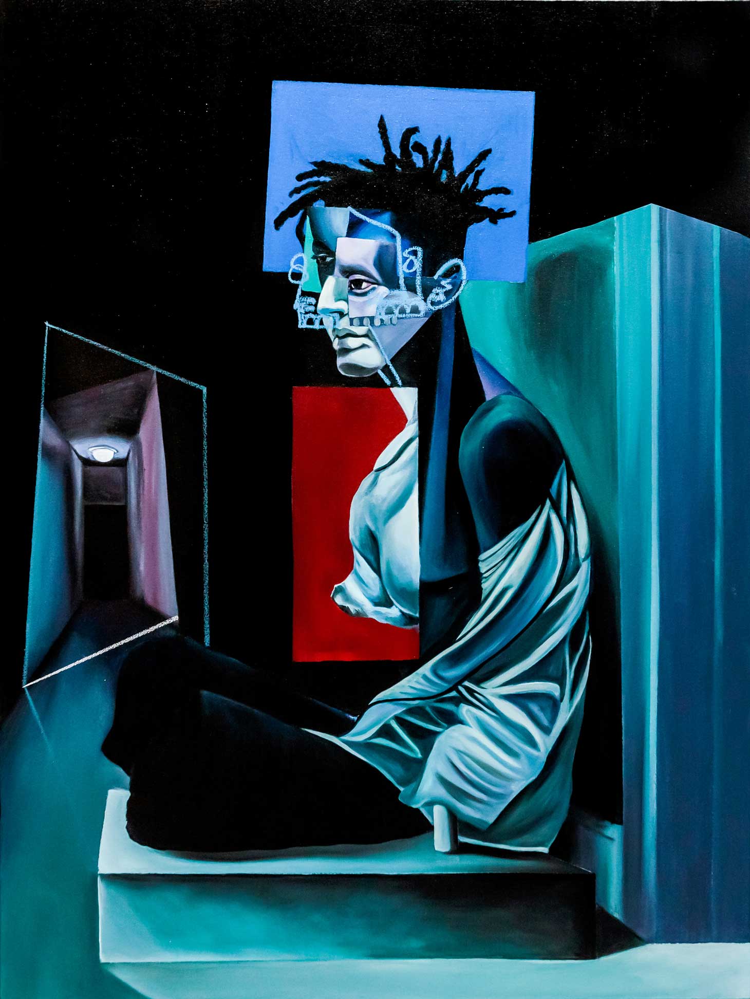 Influenced by Picasso’s Blue Period, Malik Roberts explores the repercussions of generational poverty, racism, and violence in Black communities using monochromatic hues.