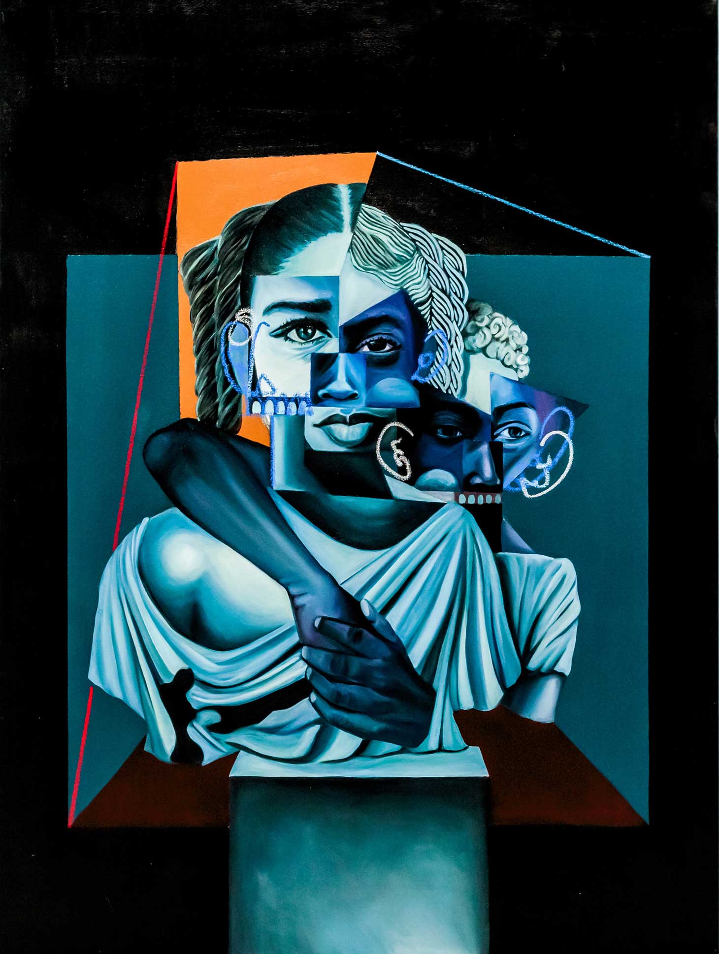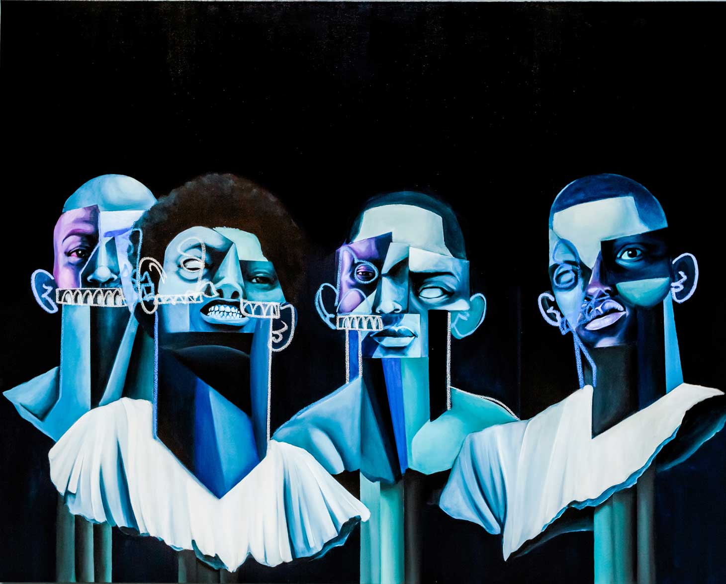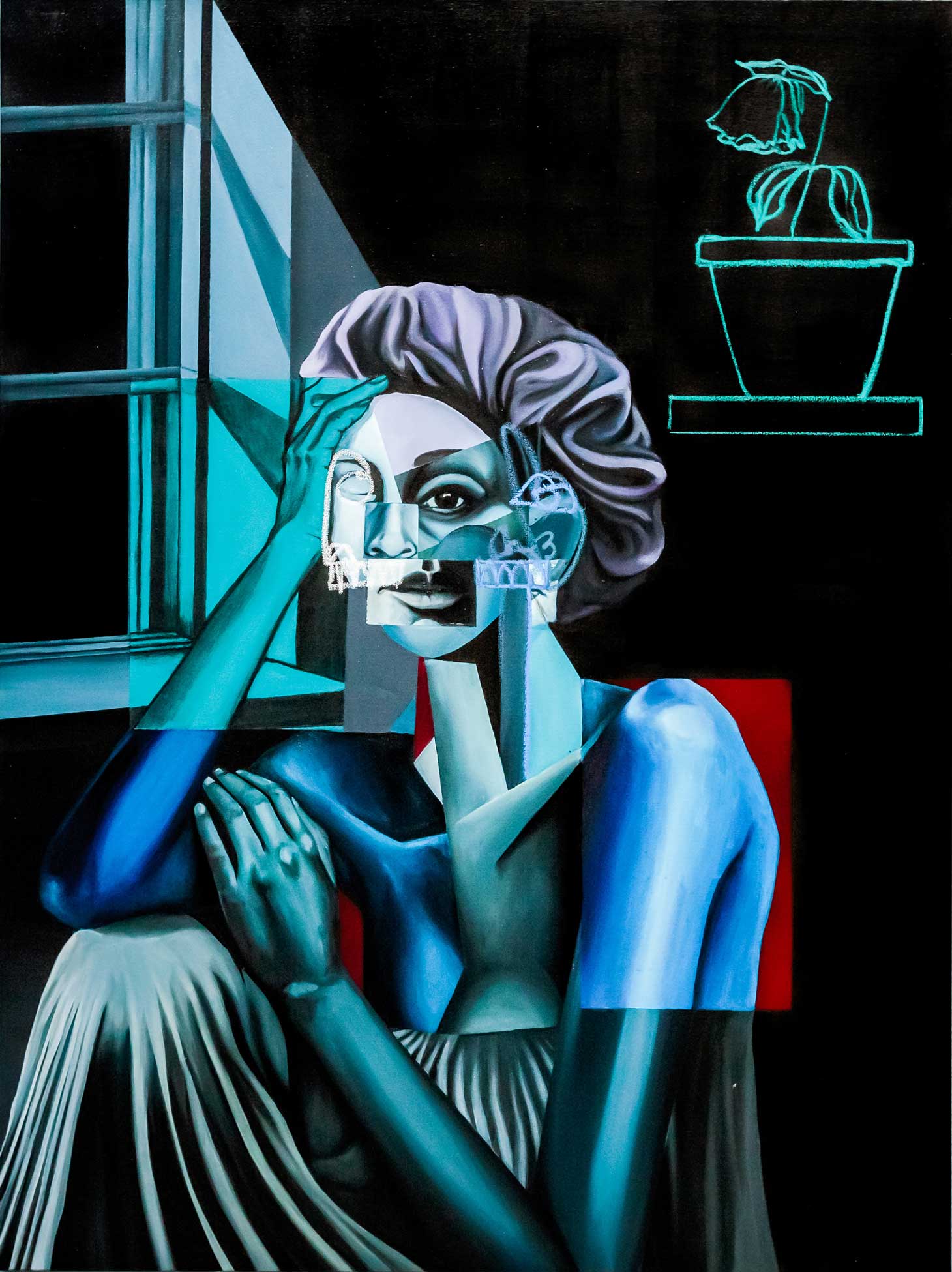 Influenced by Picasso’s Blue Period, Malik Roberts explores the repercussions of generational poverty, racism, and violence in Black communities using monochromatic hues.