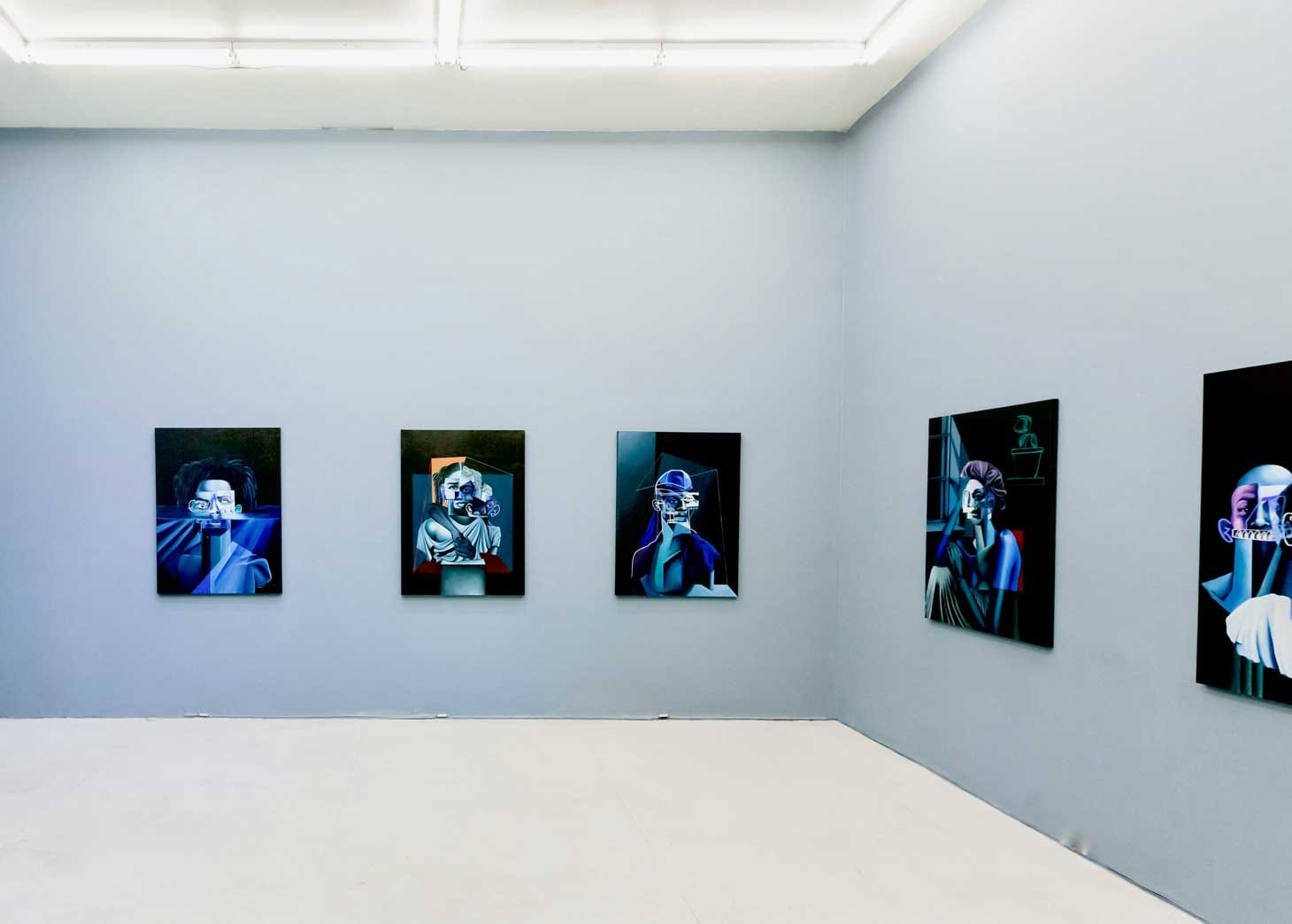 In past work, Roberts used bright, polychromatic color schemes and celebrity figures like Superman and Kim Jong Un, to comment on societal shortcomings and the infiltrating presence of popular culture. But in Blk & Blue at ABXY Gallery, Roberts more astutely explores the universality of anonymity, rendering characters who could stand in for anyone — a cousin, a sibling, a parent, yourself. These people don’t have names or identities, but you know who they are.