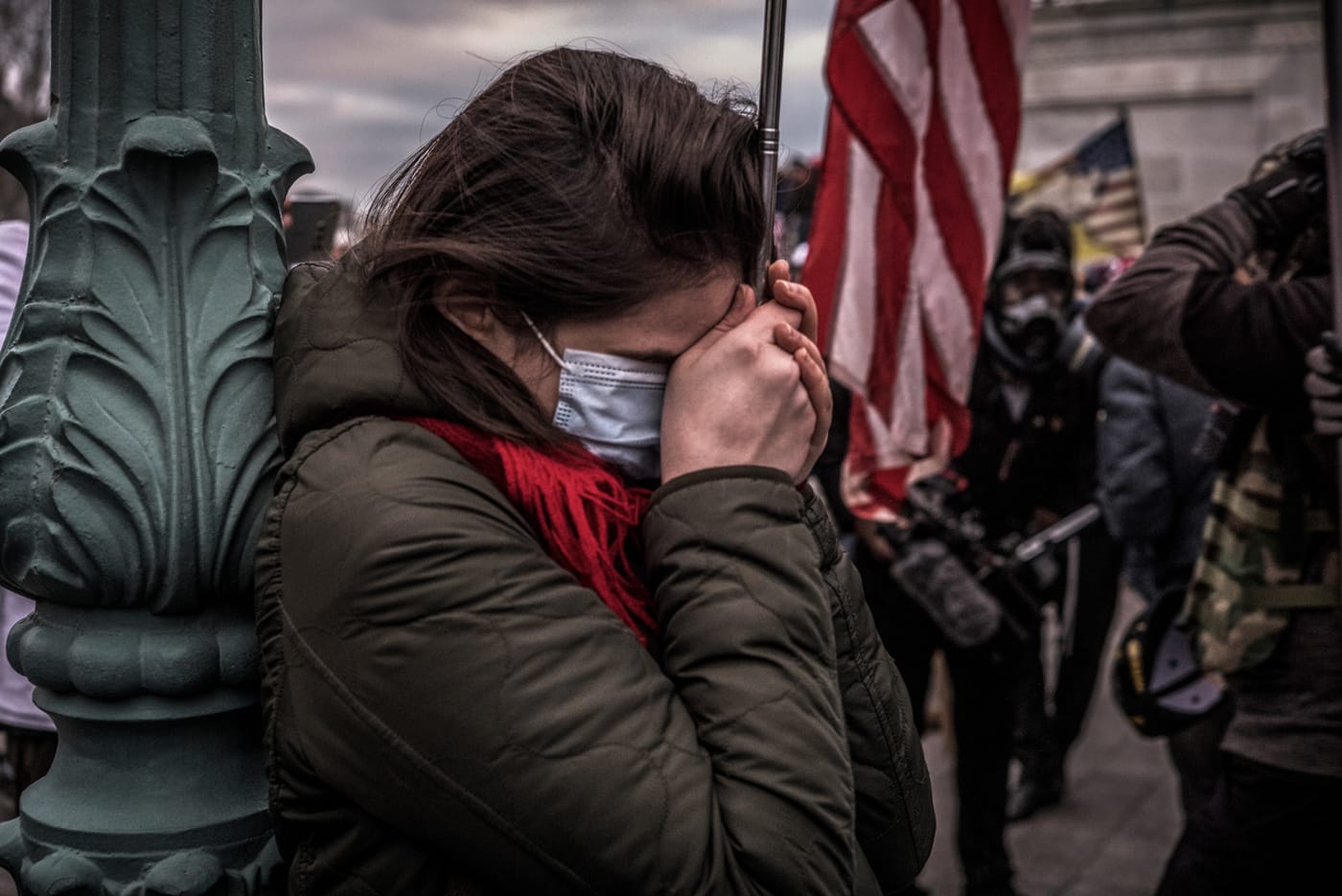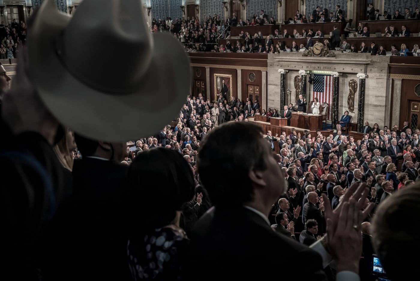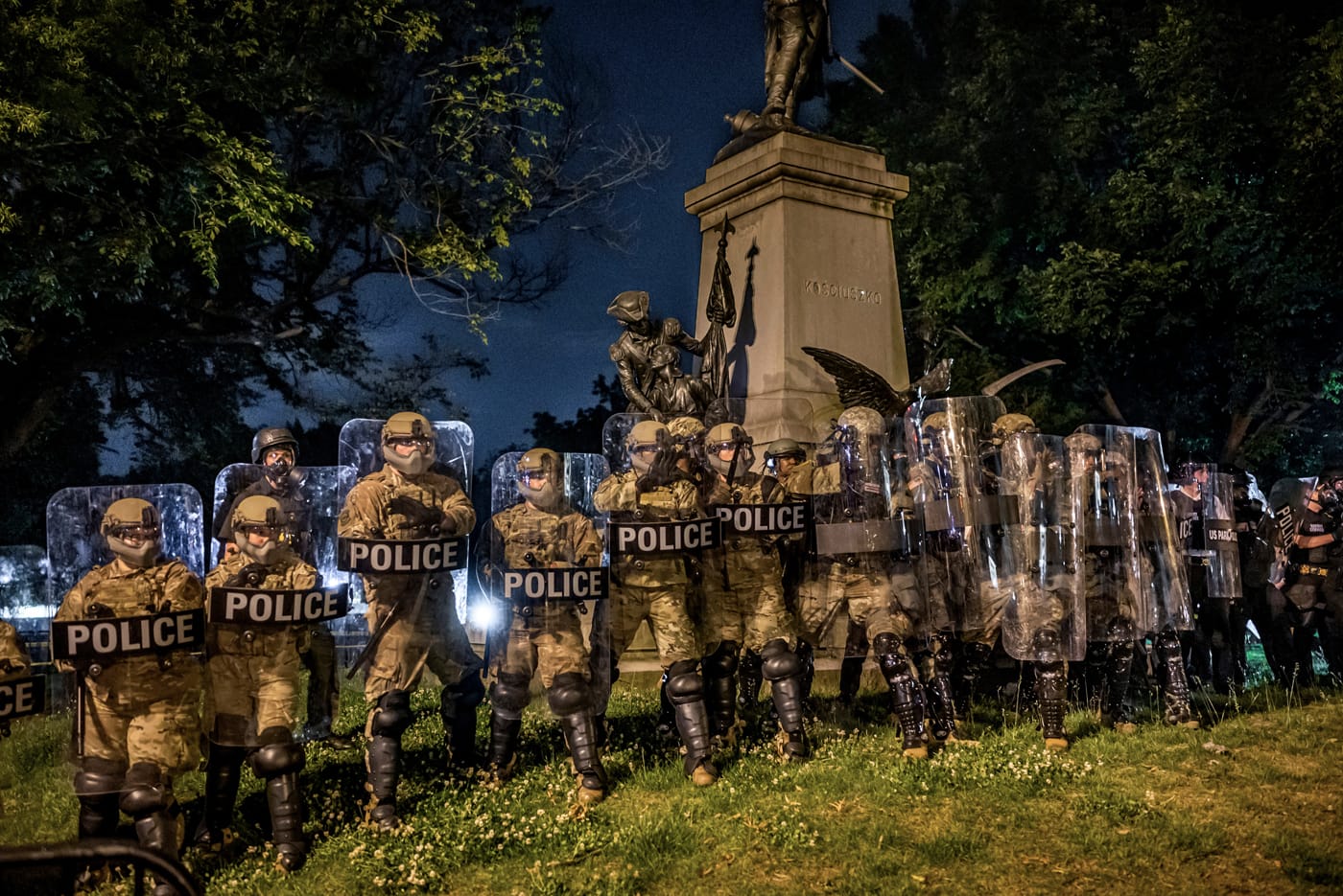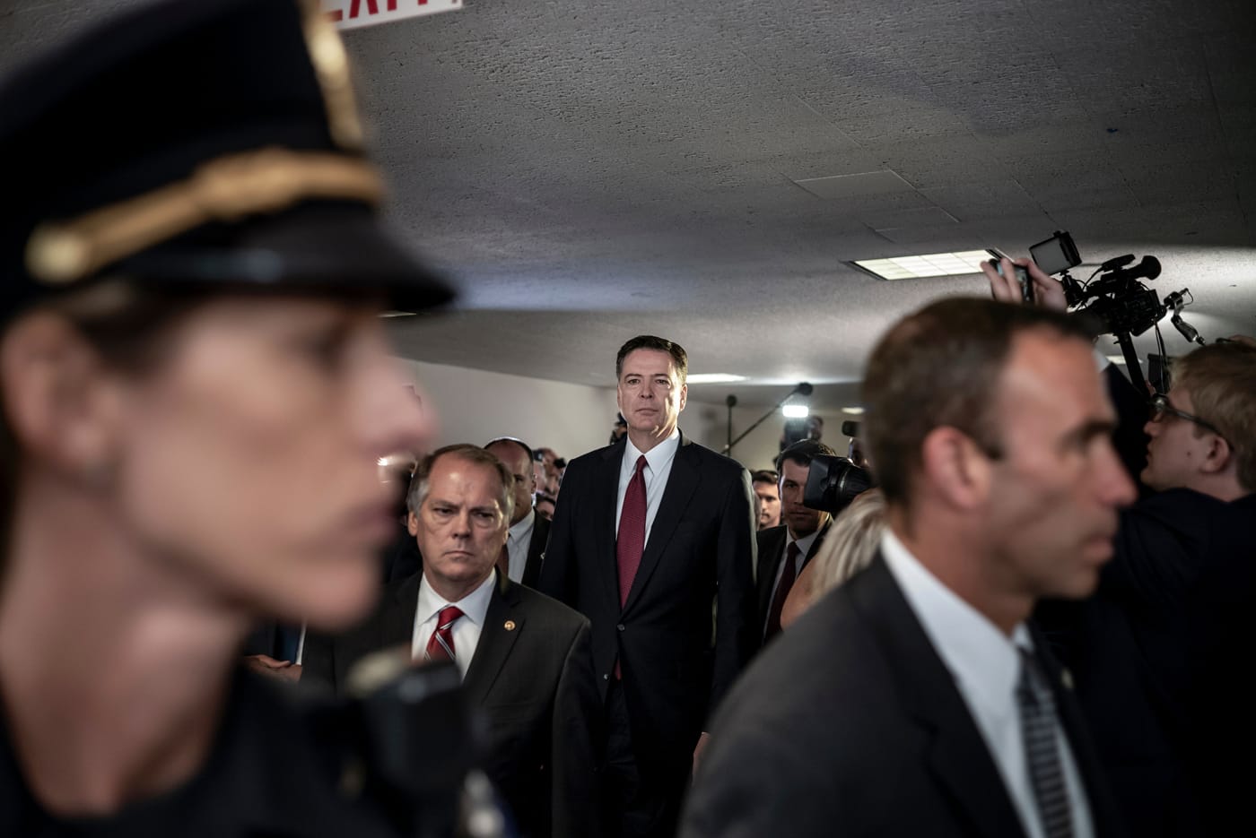 No one is smiling in these pictures. There is gravity, anxiety, anger, but no happiness and no levity. A quiet moment as an indistinct security guard patrols a hallway of the Capitol building is about the best respite we’ll see in Act III, as the profusion of masks hint at the pandemic gathering steam. On the left, Donald Trump, entering a press conference looking grim; on the right, Dr. Fauci already smiling with limited optimism for the cameras. The identical high-polish brown oxfords of the Fauci entourage, the black military boots of the four-star general at his right. Mourners at the funeral of Senator John Lewis.