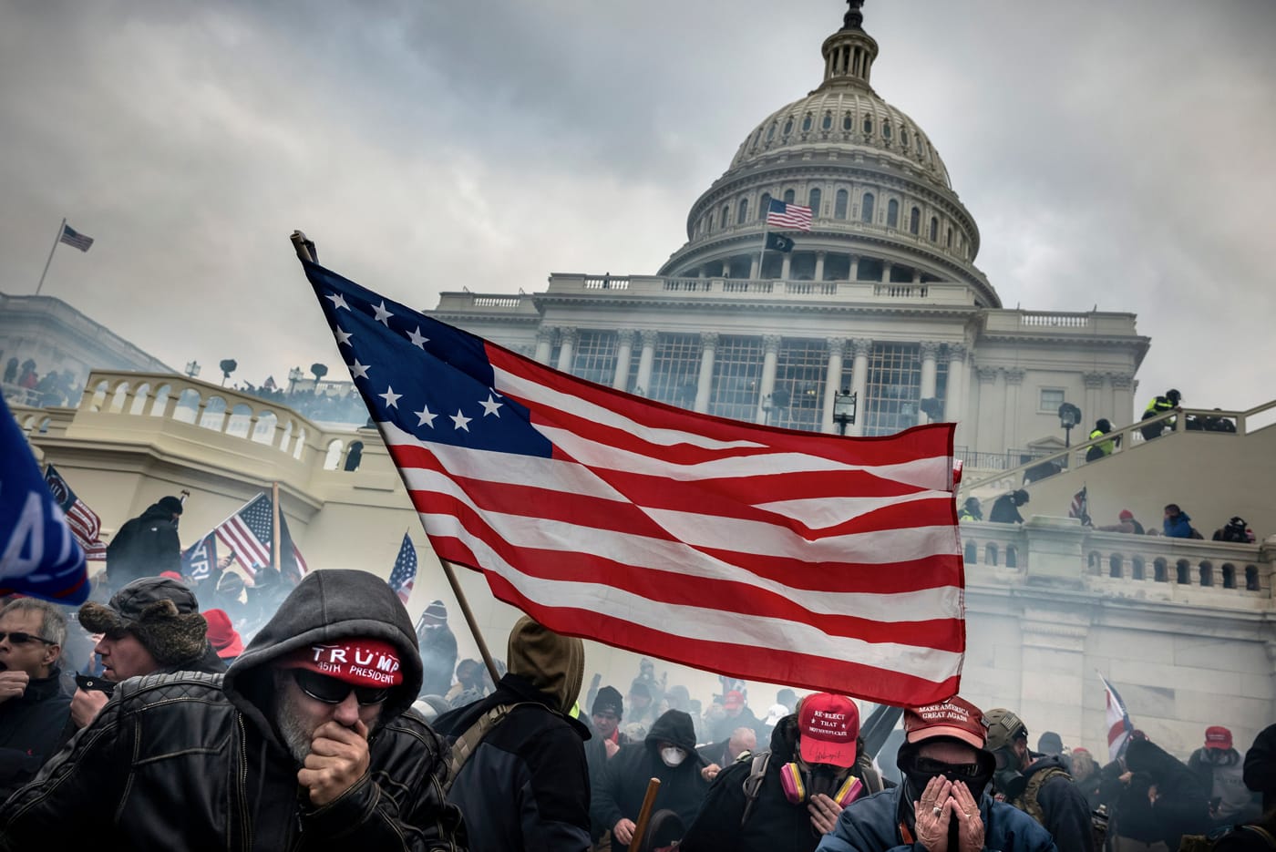 In Brink (Punctum Press, 2022), photojournalist David Butow captures many critical tableaux in a visual dissection of the US political system between 2015 and 2021. There are flags and red MAGA hats, of course, and blue buttons with Hillary Clinton’s “H” logo. There are political rallies and candid portraits of the period’s most iconic and influential players — Donald Trump, Nancy Pelosi, Roger Stone, and James Comey. There are panoramic views of the Senate floor, packed with camera techs and reporters as testimony unfolded from Robert Mueller, Mark Zuckerberg, and Brett Kavanaugh. There are Trump rallies, Antifa rallies, George Floyd protests, pro-gun demonstrators. Riot police defending statues, defending rally perimeters, being overrun as the Capitol is stormed by rioters attempting to overturn the 2020 election results. All this is dramatic, but it is also what one would expect in a survey of our turbulent recent chapter in US politics.