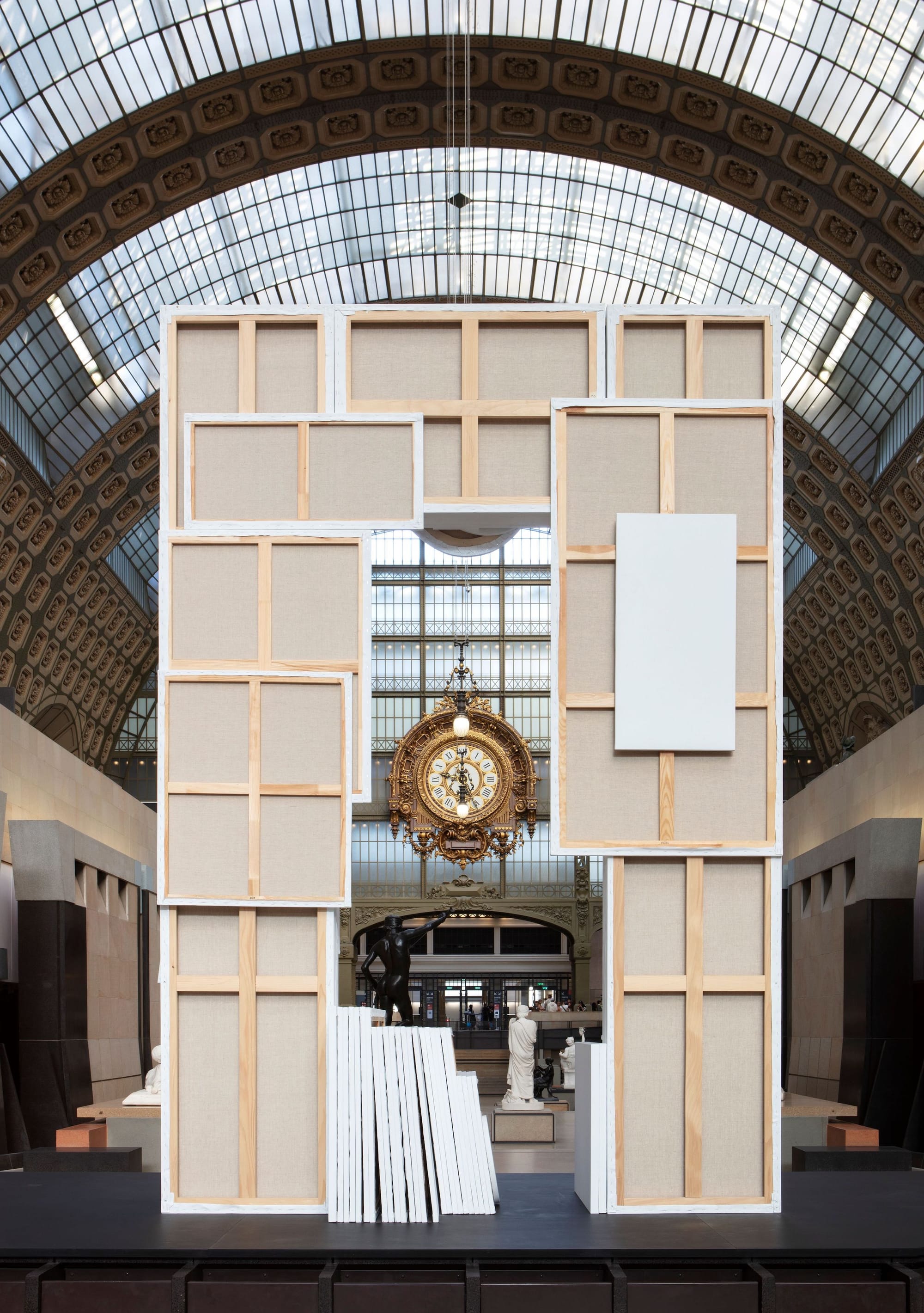 The work, installed on the ground floor on a large plinth, is constructed from various shapes and sizes of store-bought, primed canvases, all white, like the plaster model, some ovals and tondos, but predominantly rectangles. Many large squares of the same size are stacked around its base, as if ready to continue the realization of the project. According to Rutault, his paintings/protocols are never finished. Like the Rodin, it has a backside, made up of the backs of the canvases.