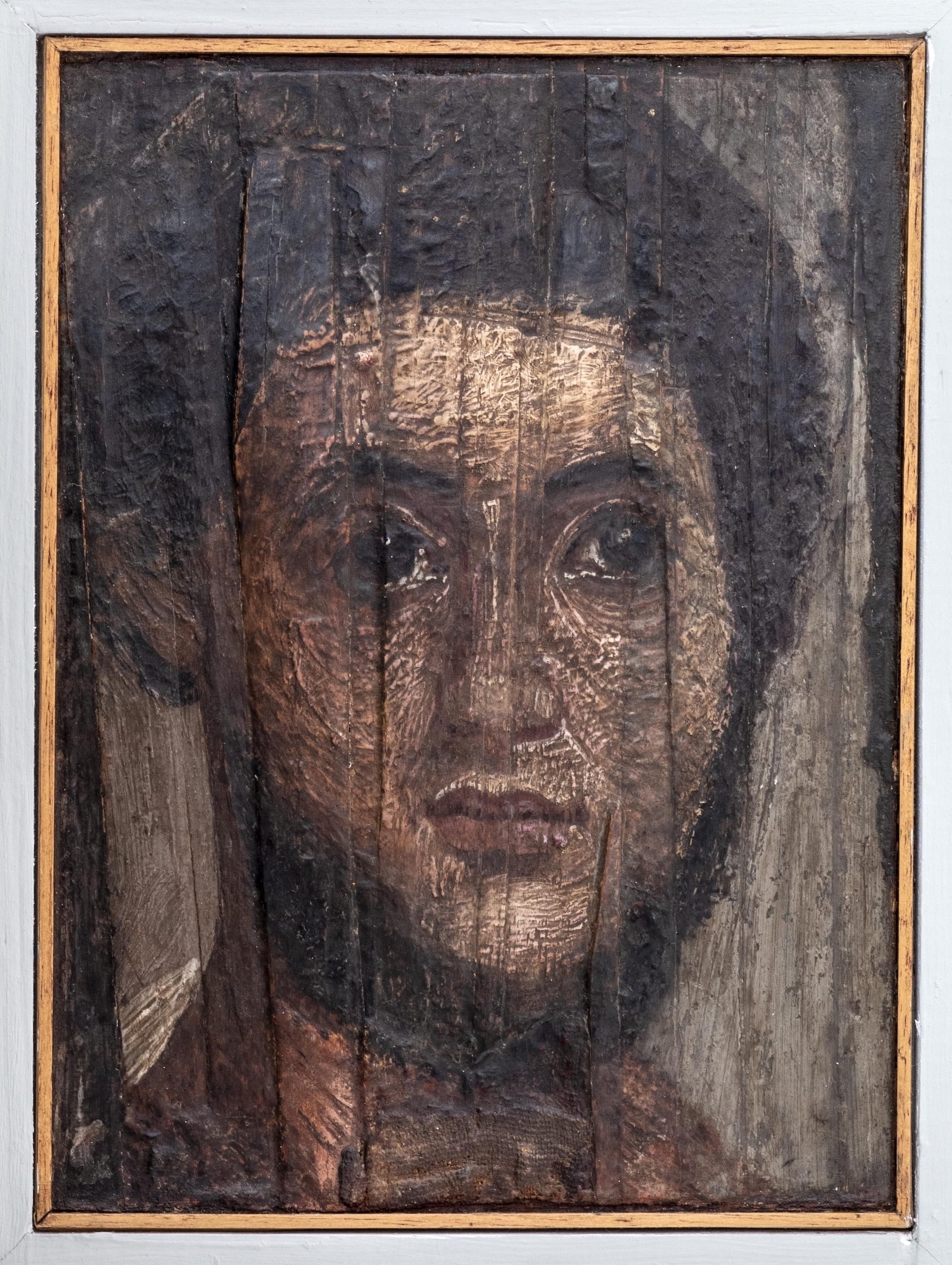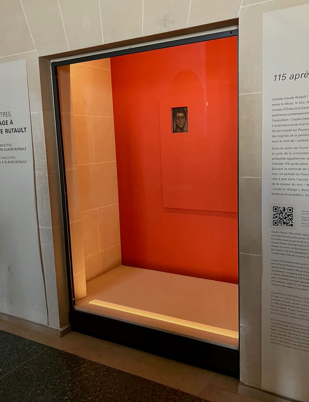 At the Louvre, continuing through September 25, is a work in which a Fayoum portrait (an encaustic mummy image from Roman Egypt) is encased in a red wall, a color that is shared with some other walls in the entrance to the Egypt wing. Rutault owned this work, motivated to acquire it by the genre’s status as the first paintings in history.