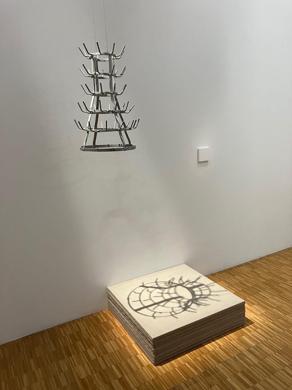 The Pompidou reprised the aforementioned installation, on a different wall and in blue. I remember it in chalky yellow. On the edges of some of the canvases, the various repaintings can be detected. Nearby is another work by Rutault from its permanent collection, “ready to be made” (1994), in which a suspended “Porte-bouteilles” (1914/1964) by Marcel Duchamp throws a precise shadow over a stack of eight unprimed canvases that are the same proportions as Malevich’s “Black Square” (of which an unusual version, painted on white marble, is in the collection). A small white canvas on the white wall near the suspended readymade functions like a blank caption square. Both Malevich and Duchamp presented decisive historical challenges to painting.