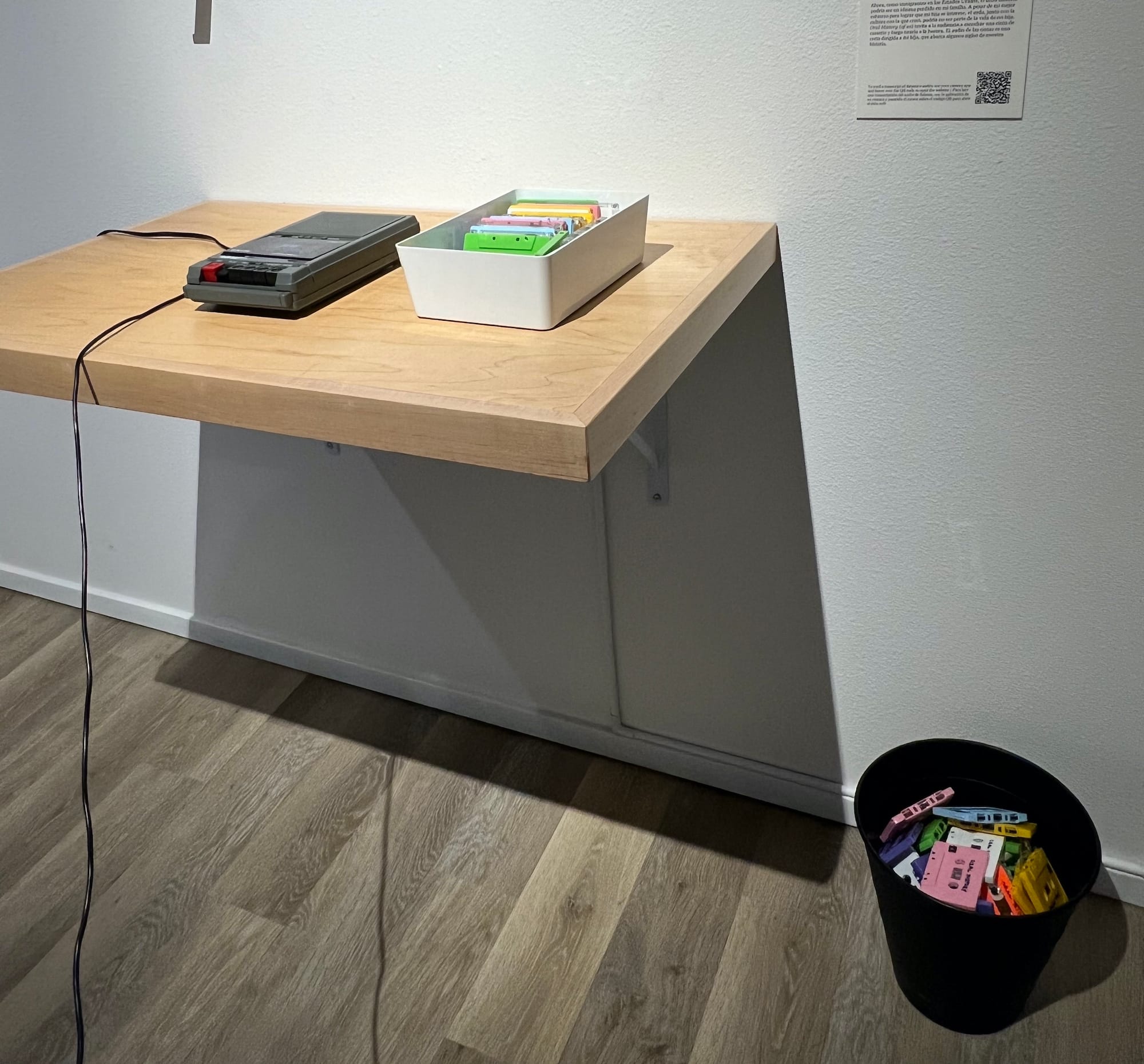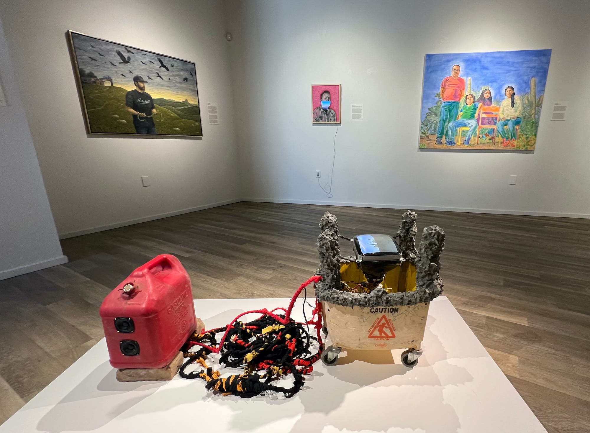 The most impactful works include Estephania González’s 10:08-minute digital video “Huitzilopochtli” (2021), in which a celestial being’s “reverse migration journey” from northern Arizona to the borderlands speaks to the trauma the border wall inflicts on “the land, animals, and immigrants,” as well as “Oral History (of us)” (2022) by Pakistan-born Safwat Saleem. In the latter installation, cassettes feature the artist reading a letter recounting several generations of family history to his young daughter, accompanied by a trash can where listeners are instructed to discard the tape after they hear it. It’s a symbolic gesture suggesting expectations that migrants should discard or minimize their cultural identity as part of the assimilation process.