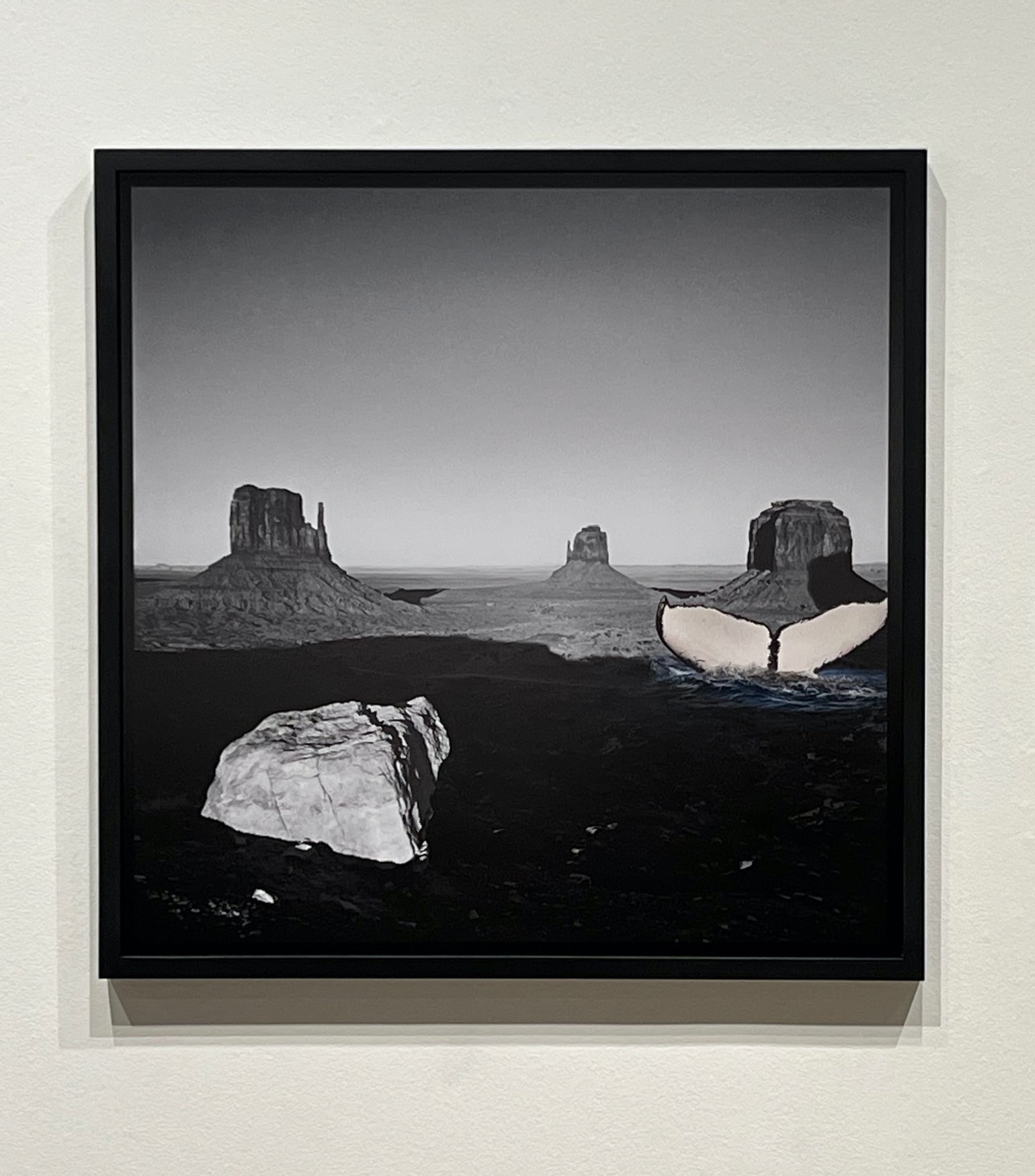 Although the museum didn’t call for art rooted in borderland environments, this year's biennial nevertheless amplifies the ways a profound sense of place informs a significant number of Arizona-based artists working with a diverse spectrum of materials. One such piece is Alejandro Macias’s “Five Minutes of Solace (Self-portrait)” (2022), which reflects the difficult physical and cultural spaces traversed by migrants by interrupting the lower portion of his mixed media portraits with video of borderland terrains played on an iPad mounted behind the canvas.