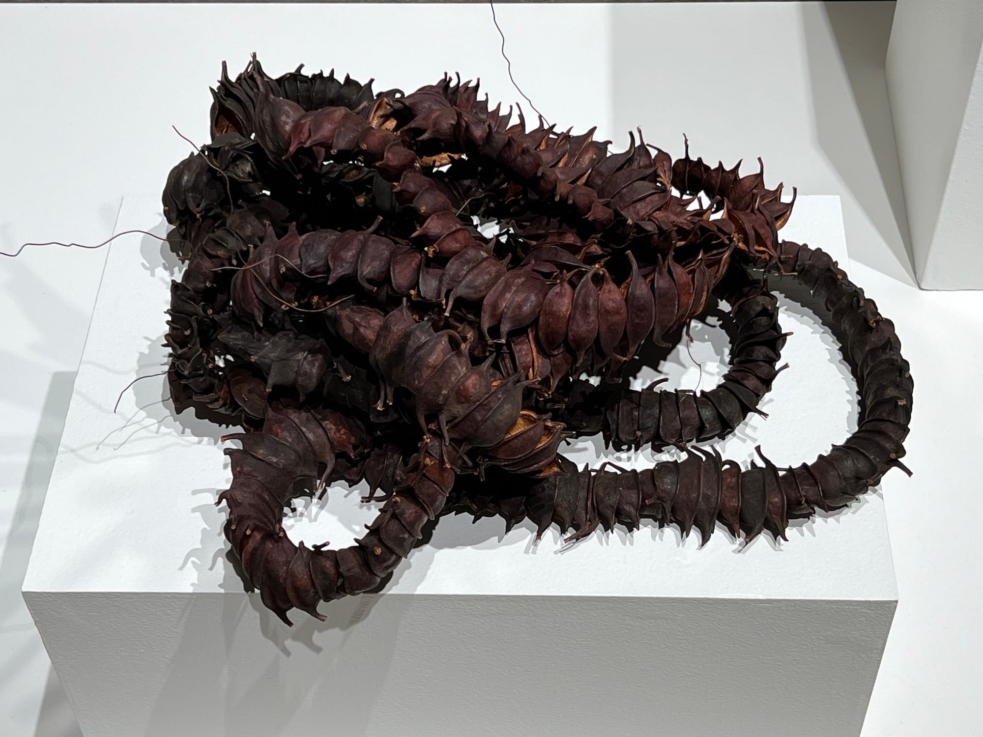 Across the gallery hangs a tall stack of aloe shoots strung together with found wire by artist Nikki Berger Martinez. The two works are separated by an open space that suggests a chasm between the beauty and barbarism within the borderlands. Existing together as if under a shared desert sky, Pineda’s 2022 installation “Reverencia: Arizona Migrant Death Mapping (nos. 1–3 of 11)” and Berger Martinez’s 2021 “Untitled #2” signal the complexities of this region, with its layers of life and death, emergence and decay.