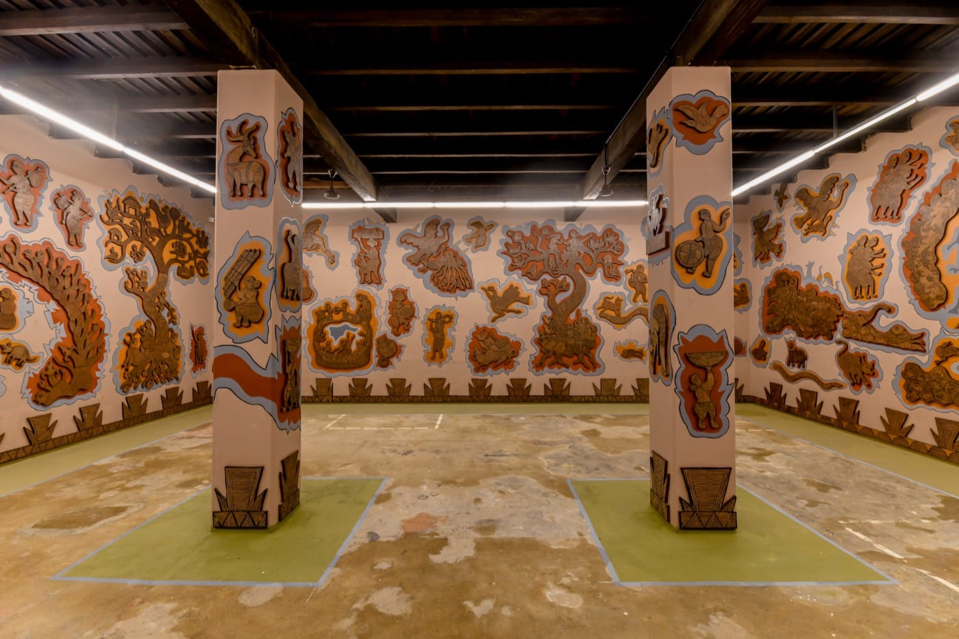 Part of KMB also expressly deals with the need to reconcile latent histories with the present. One of the most impressive installations, also at the Aspinwall House, is a work by Durgabai Vyam and Subhash Vyam. Their massive room-sized wall mural evokes Gond folklore traditions practiced by one of India’s largest and oldest tribes. Inside, wall mounted sculptures and paintings done on marine plywood are cut into various shapes outlining the fauna and flora of a popular Gond folklore, the ancient story of Dus Motin Kanya and Jal Devata, which describes a sister and her five brothers living in complete reciprocity with the cosmology of nature. The sensual human and animal figures set against earthly scenes evoke a sense of awe for the sheer vastness and scale of it alone, reminding me that modernization has brought with it many unintended consequences — perhaps none more sinister than our separation from the natural environment. The work, “Infra-project” (2018), subverts conventional frescoes typical of Gondi visual culture, including notable mahura-style inspirations taken from the intricacies of her community’s jewelry art.