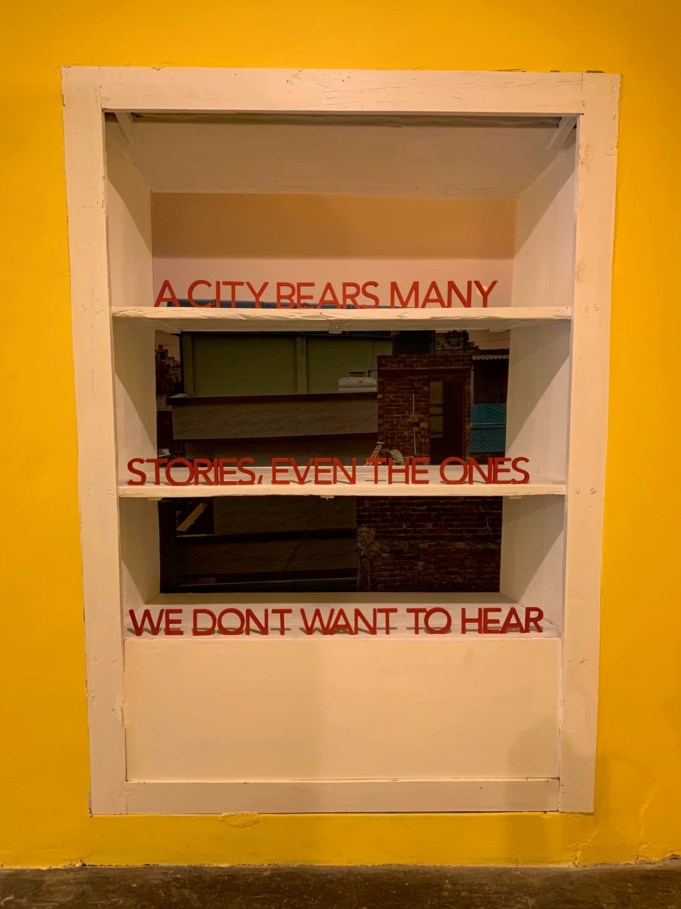 Part of the biennial’s strength, comparatively, comes from platforming projects responsive to the rapidly changing social and political dynamics within India today. An example of this is Sunil Gupta and Charan Singh’s collaborative work “Dissent and Desire” (2018), which consists of portraits and videos of their friends — who are members of the LGBTQ community living in and around Delhi — installed in a bright yellow room designed to resemble the artists’ living rooms. Only a few months earlier, in September 2018, homosexuality was at long last decriminalized in India with the overturning of Section 377 of the penal code which had previously forbidden sexual activity between people of the same gender. The artists wrote to Hyperallergic via email: