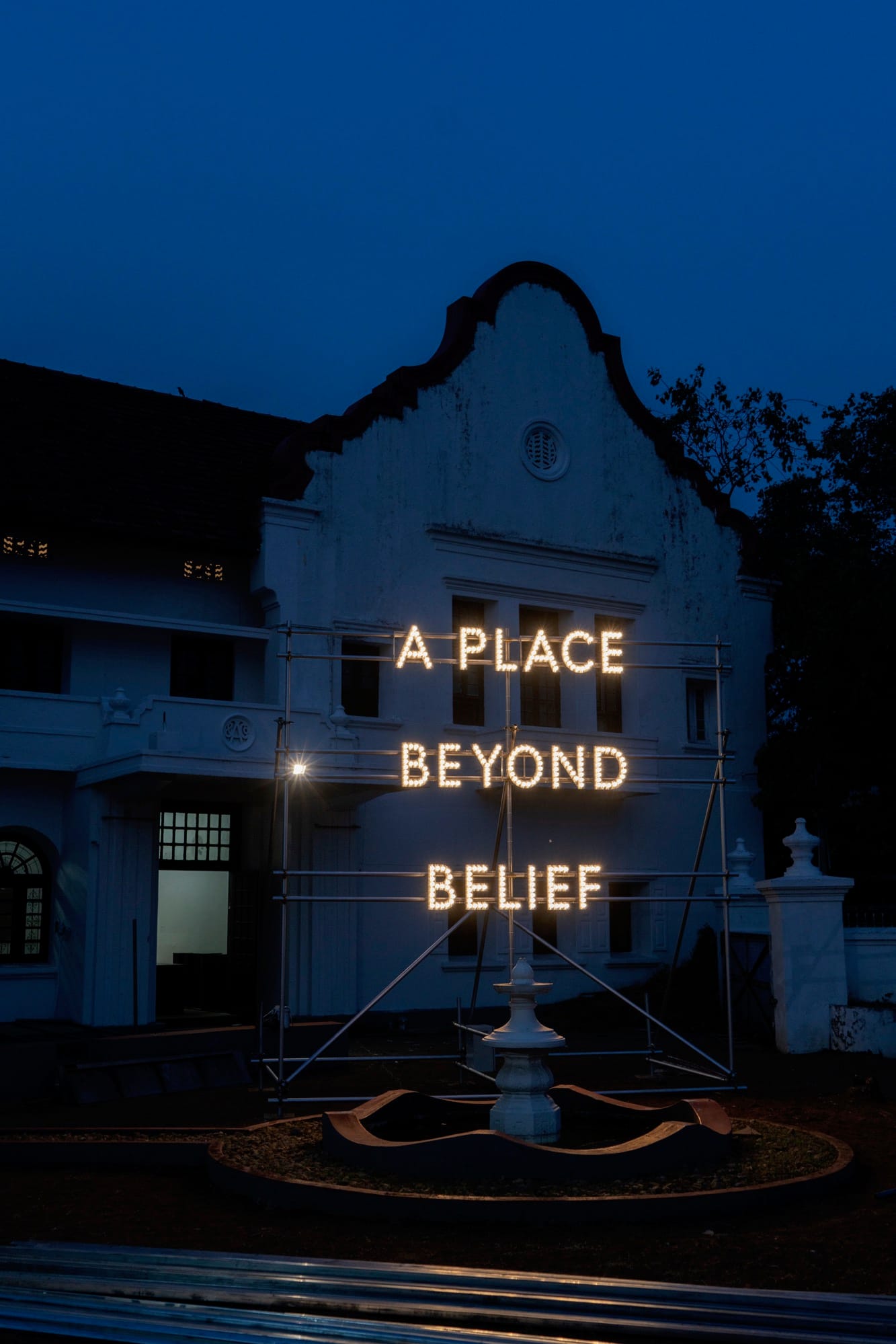 Among the benefits generated by the biennial is a revitalization of parts of the infrastructure that had fallen into disuse. In India, a country indelibly marked by centuries of colonialism, the use of derelict and former colonial structures has been a part of KMB’s footprint since the beginning. By reappropriating many of Fort Kochi’s spaces that had been left in disrepair for decades, the biennial has nurtured a positive impact on the urban development of the city. For example, KMB’s largest venue, the Aspinwall House, is a sprawling sea-facing heritage property that contains a number of warehouses and smaller outlying structures. Established in 1867 by English trader John H. Aspinwall, the remarkably unique venue was at different times during its history used to store coconut oil, pepper, timber, lemon grass oil, ginger, turmeric and other spices.