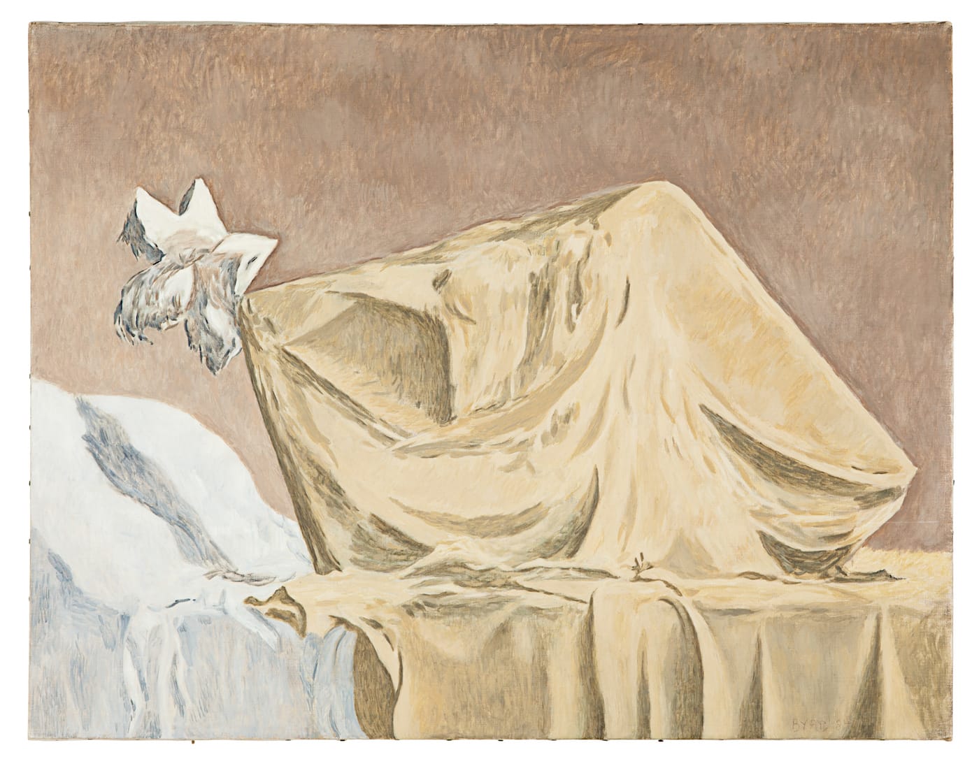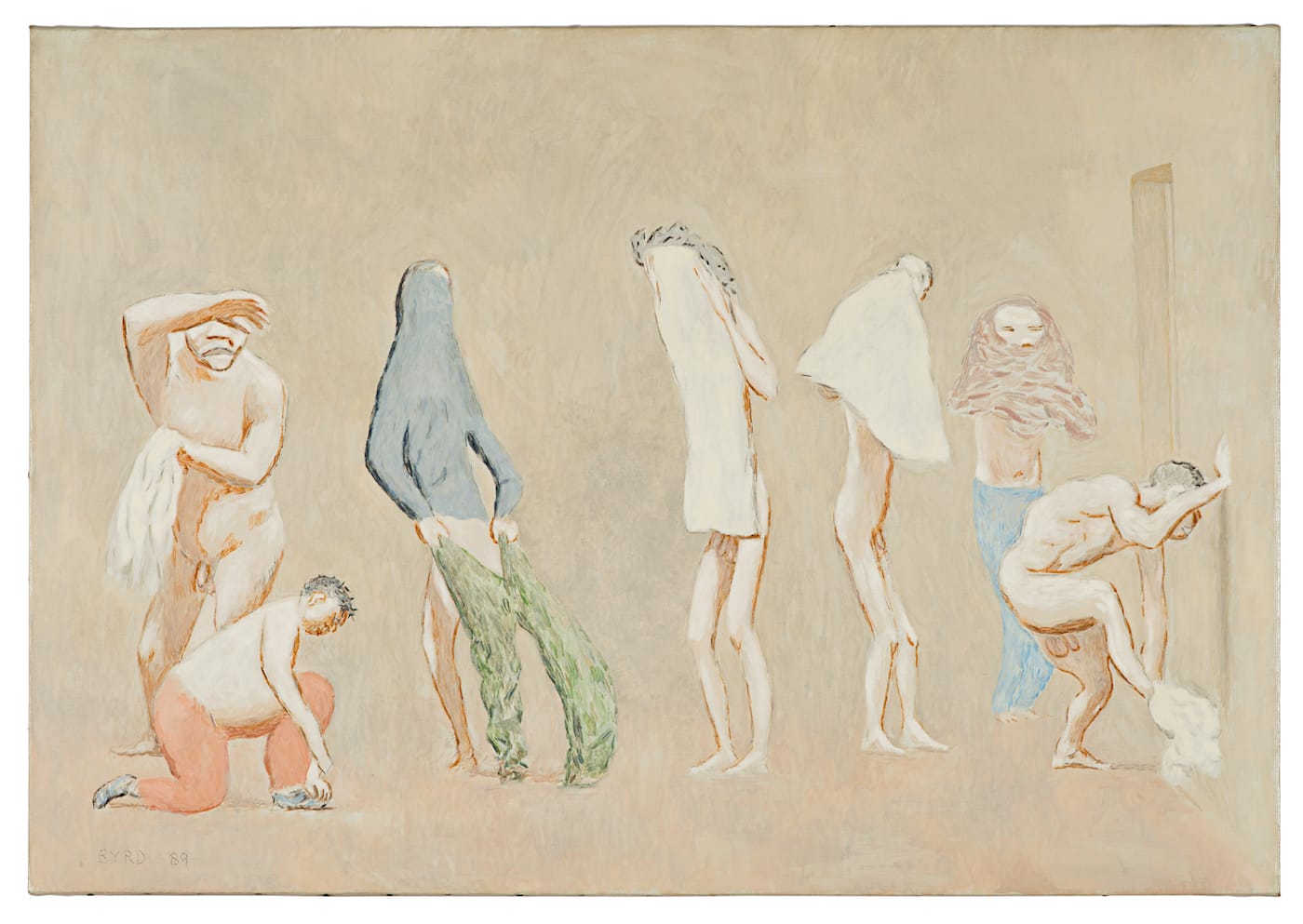 Painted thinly with a dry brush and a muted palette, the works are displayed unframed with tack nails running along the sides of the canvas. About a third of the images grapple with Byrd’s experience at the VA hospital. Set inside confined institutional spaces — corridors, rec rooms, cafeterias, shower rooms and bathrooms — the paintings show men standing in line for food or medications, dressing, showering or morphing into eerie accretions of cloth inside their beds.