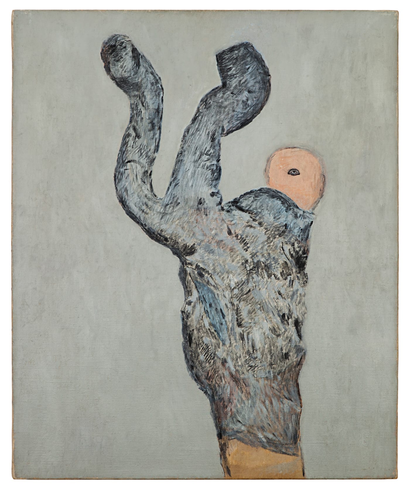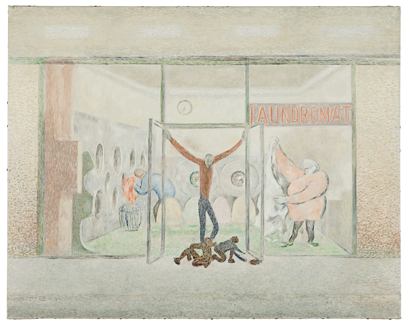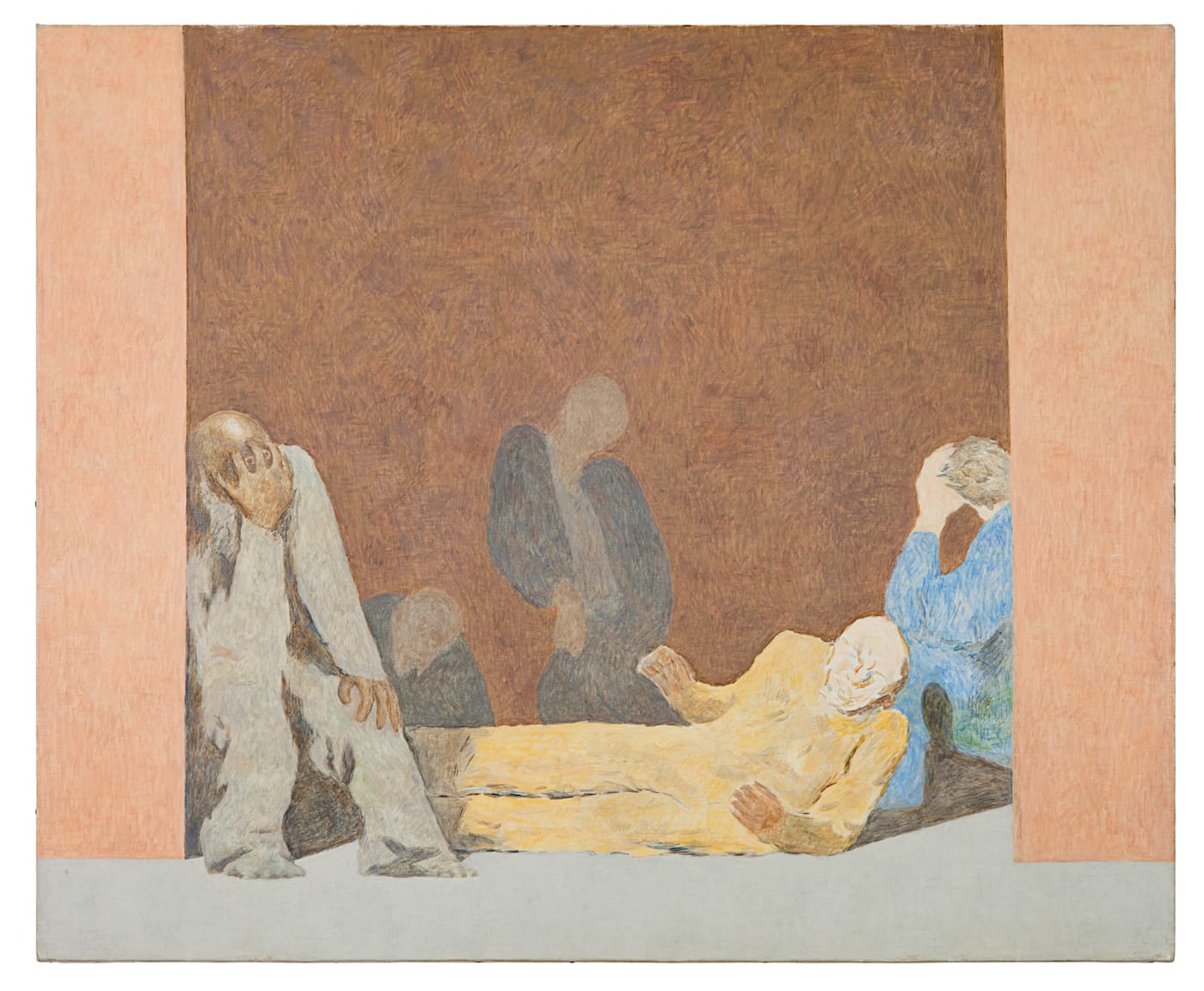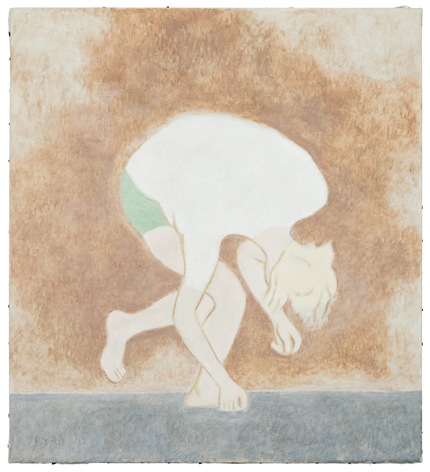 Warped, cockeyed, and geometrically unhinged, Byrd’s alienated human figures — whether inpatient or on the outside — are often at odds with gravity itself. They stoop, prop themselves up or sprawl out on the floor, their shoulders hunched lower than Picasso’s “Old Guitarist.” There are no portraits and no close ups. Spaces entrap with sparse perspectives dead-ending into blank walls. Reified by madness, medications, and a system of power that keeps them in a state of docility, the patients resemble Giorgio Morandi’s contorted still lifes.