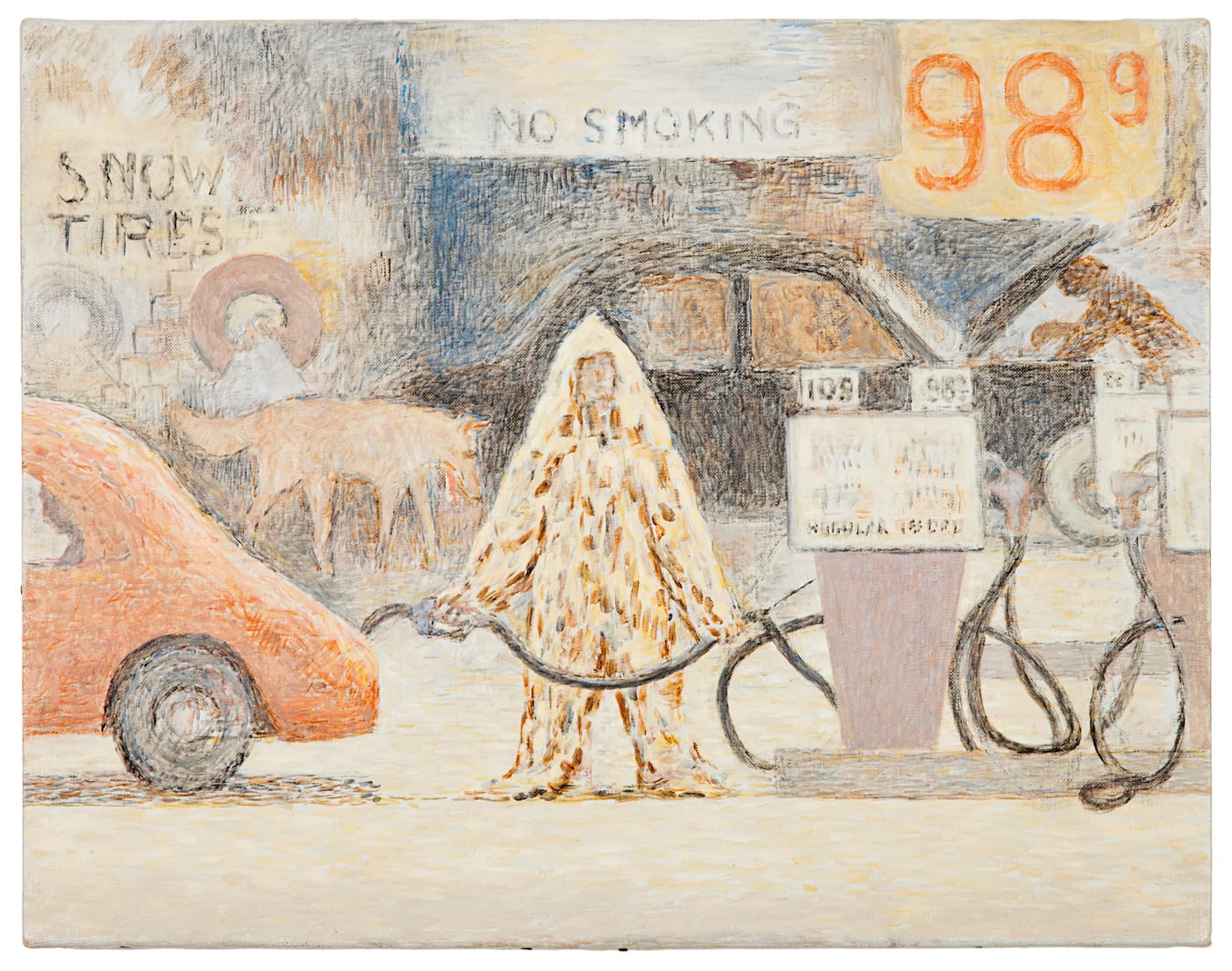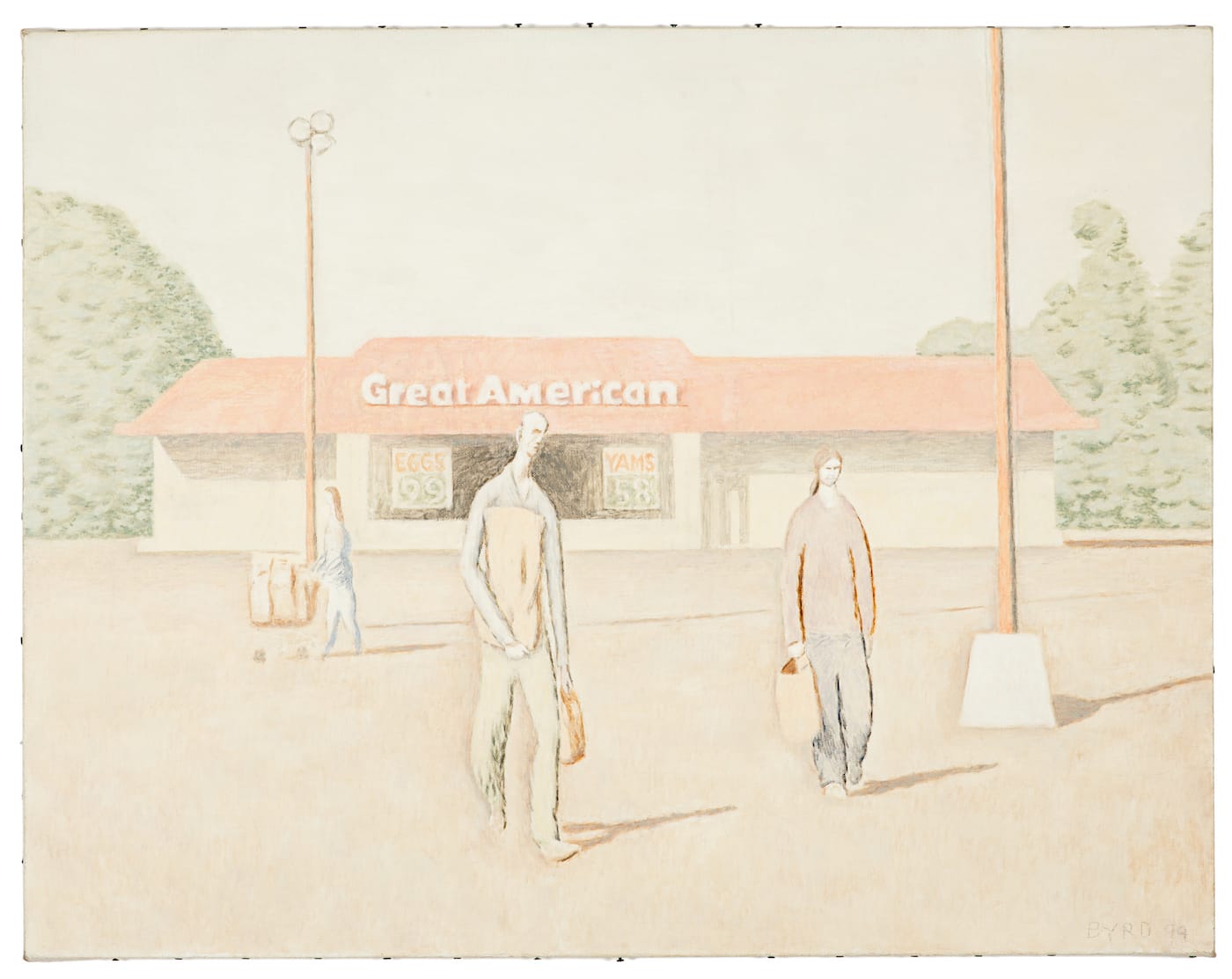 Byrd’s paintings of Sidney Center’s residents, whom he observed on his trips into town, emanate a similar air of entrapment and disconnection. For me, the most compelling of such scenes is Byrd’s “Great American.” Three figures carrying paper bags, elongated like Giacometti’s figures, cross an empty parking lot without line stripes. Behind them looms a grocery store called “Great American.” Eggs are on sale for 99 cents, yams for 58 cents. The sky is a creamy, cloudless, humid void. The paint is so oversaturated with white that the three shoppers seem on the verge of disappearing into the light, as if casting their sharp shadows for the last time.