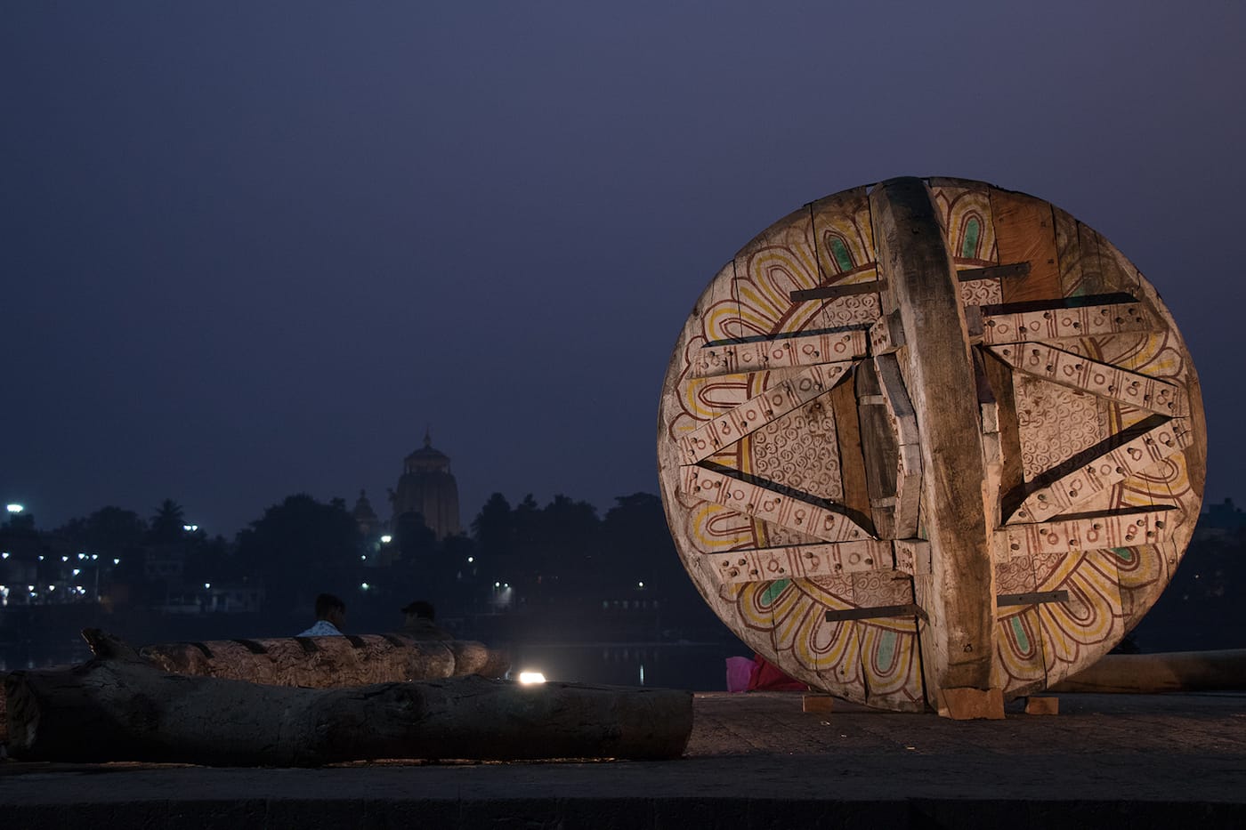 In Cécile Beau’s “The Vaporous Region,” hundreds of tiny terracotta diyas or lamps envelop a large wire armature to become the delicate scales of a giant celestial fish. Arunkumar H.G.’s “Wheel of Tradition and Faith” repurposes two massive wooden chariot wheels employed in the annual Ashokasthami Rath festival of Lingaraj Temple. Artist M. Pravat has chosen to work with laterite, a porous stone ubiquitous in Old Town temple architecture. In Pravat’s “The Malleability of All Things Solid 4,” blocks of the coarse laterite are transformed into a massive russet-colored sphere. The grid-like seams of its construction evoke the parallels and meridians of an atlas, transforming the sphere into a towering, pock-marked globe.