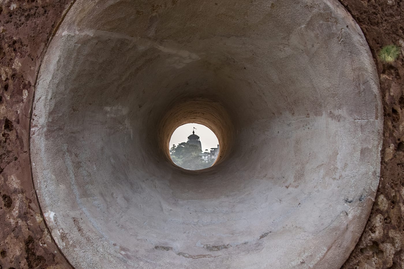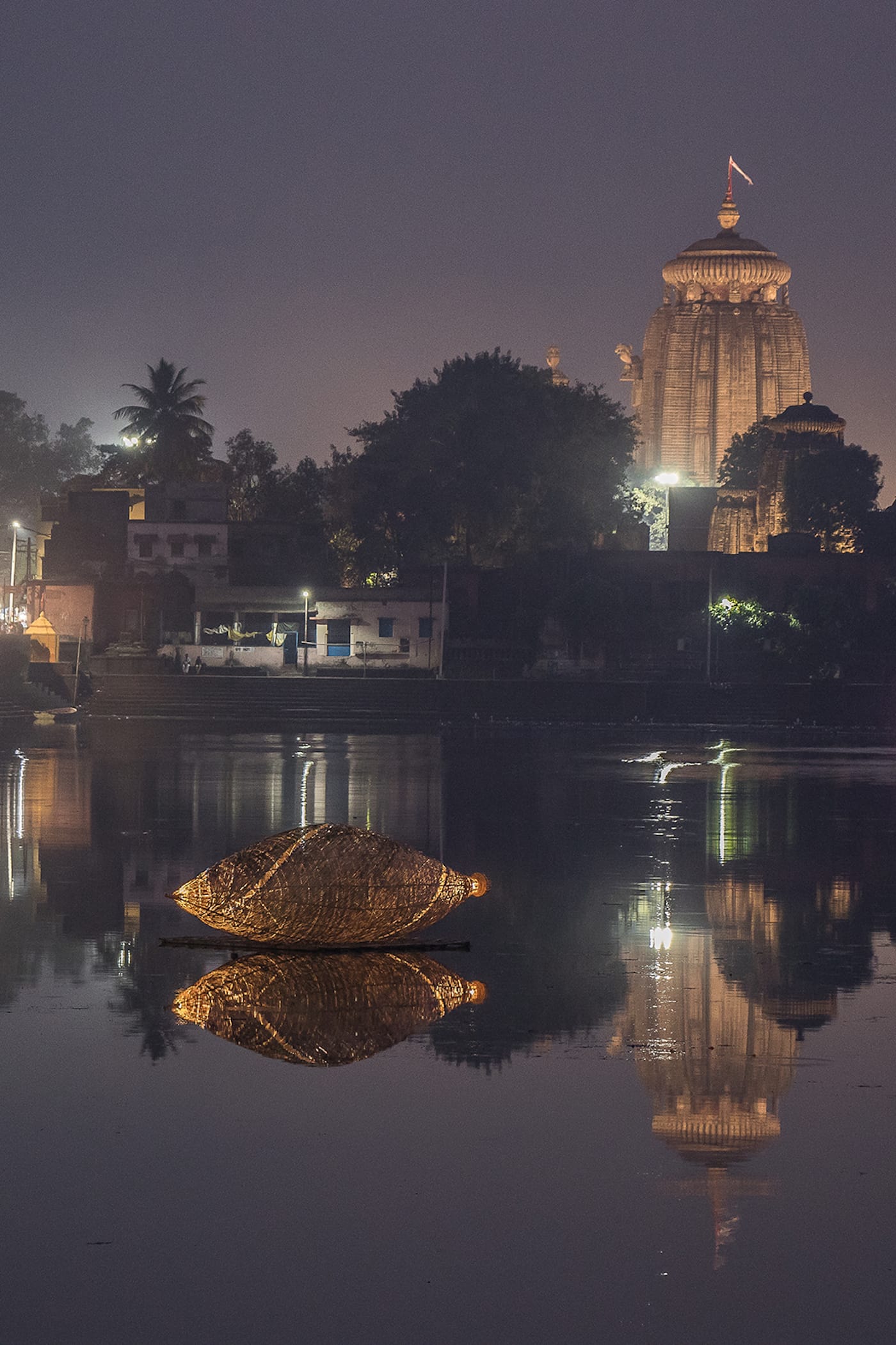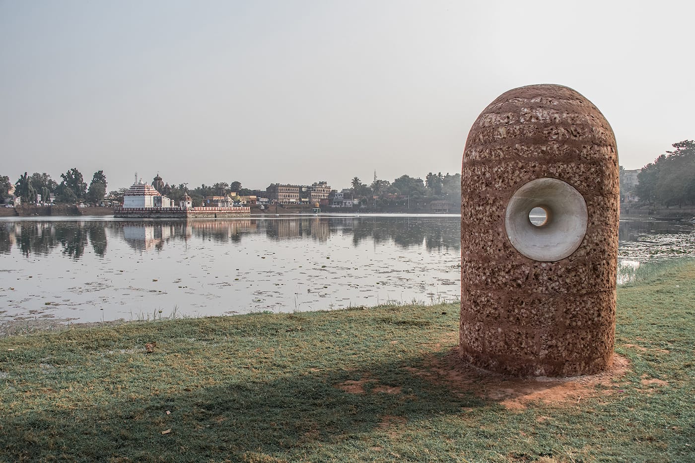 The Trail’s strongest works drop anchor into the Old Town’s history and build up from there, forming new positions from which to survey its physical and cultural features. Offering a literal re-framing of the city is Sibanand Bhol’s “Liminal View,” a large lingam-shaped sandstone column positioned on the bank of Bindu Sagar Lake. Piercing the column is a circular aperture through which the distant silhouette of iconic Lingaraj Temple is perfectly framed. Embodying a literal eye to the past, “Liminal View” offers a vantage point for visitors to contemplate an inherited past from the station point of the present.