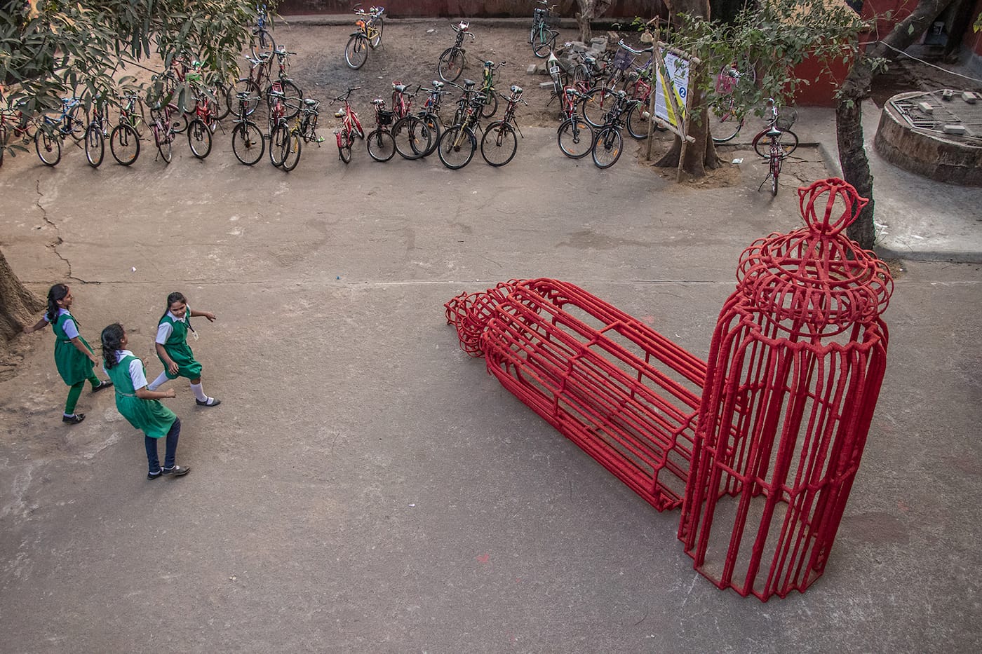 BHUBANESWAR, India — In Bhubaneswar, India, a new public art trail has opened its inaugural edition. The Bhubaneswar Art Trail cuts a winding three-quarter-mile path through the city’s Old Town district, a region known for its many distinctive ancient Hindu temples. The trail leads visitors through unexpected exhibition locales, including schoolrooms, temple complexes, gardens, and private residences of some willing local inhabitants. A 150-year-old monastery hosts “Reflection of Time and Nature,”a quiet work by textile artist Pankaja Sethi, comprised of a large metal armature loosely woven with hand-spun jute and cotton.