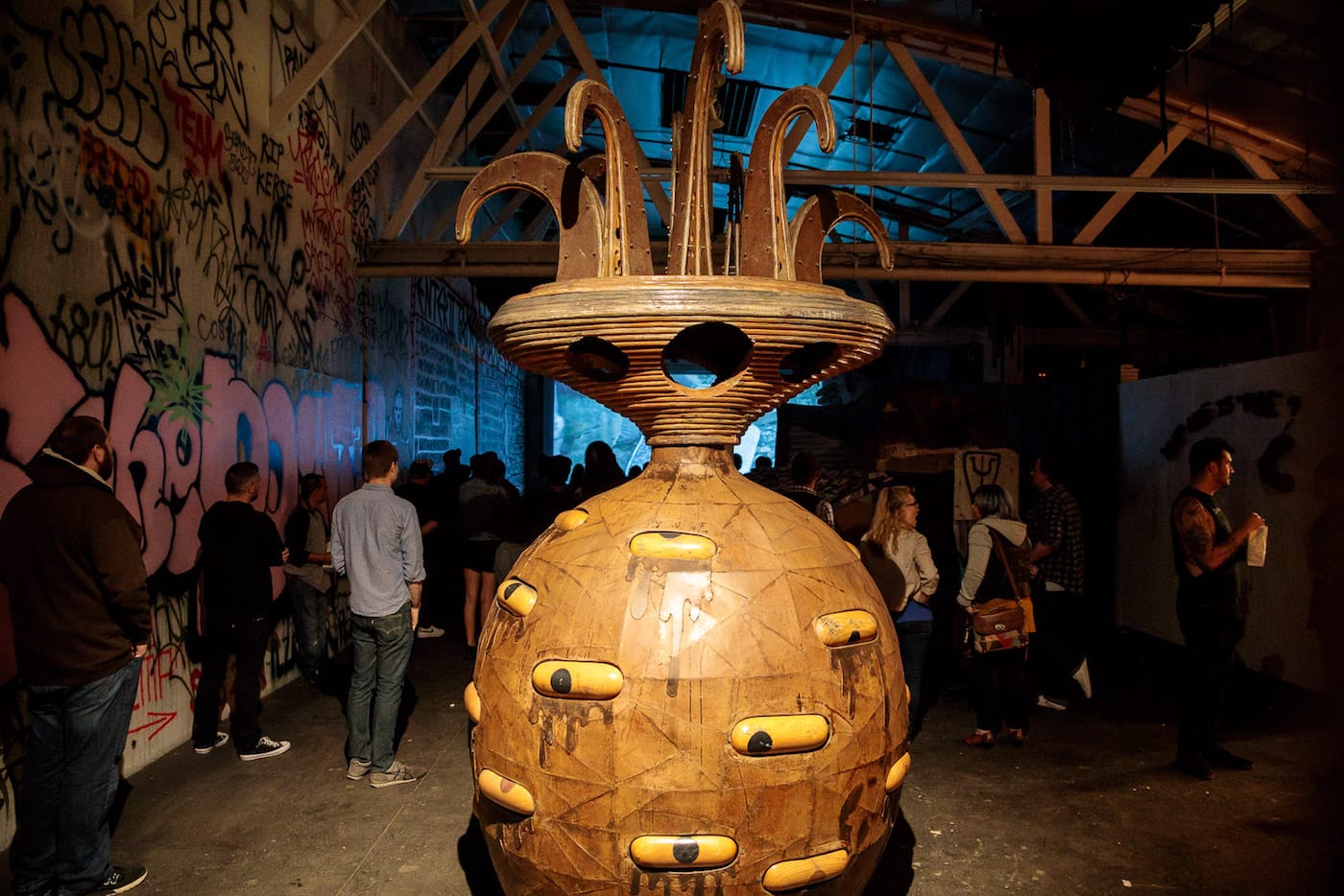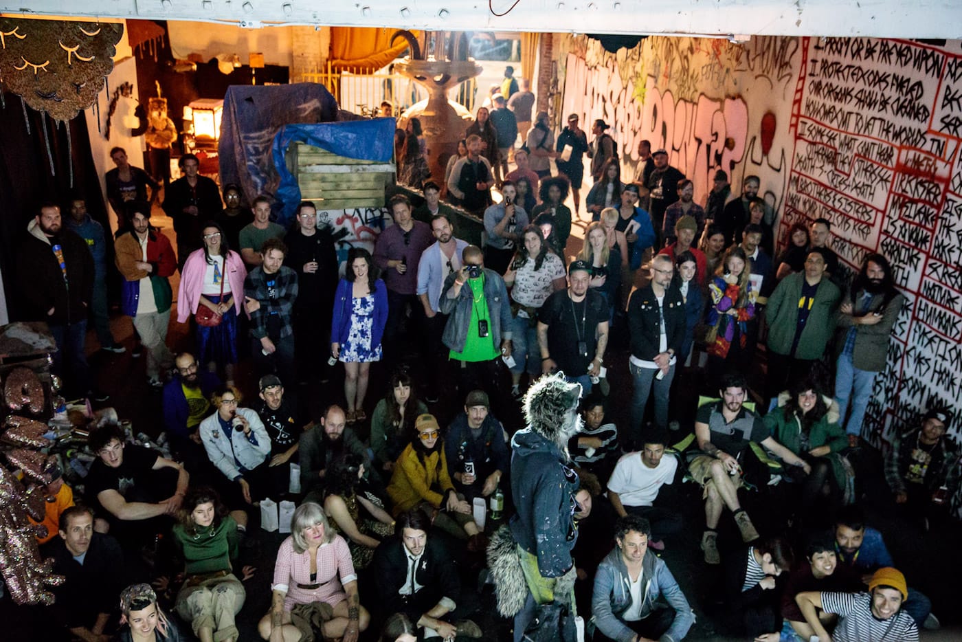 If, on a recent Saturday night, you happened to find yourself walking down a desolate street at the edge of L.A.’s Skid Row, you might have passed an open warehouse roll gate in a building displaying a Swoon mural on the exterior. Inside that warehouse, you would have immediately encountered a giant multi-eyed upside-down alien next to a wolf serving fresh popcorn. A film was screening deep inside the space, and if you made your way past the small shack with a roof made of compressed spray cans — and didn’t trip over another pile of empty paint cans with a small metal chimney spewing glittery cloud letters — you would have joined a room full of people watching Wastedland 2, the most recent work by punk filmmaker Andrew H. Shirley.