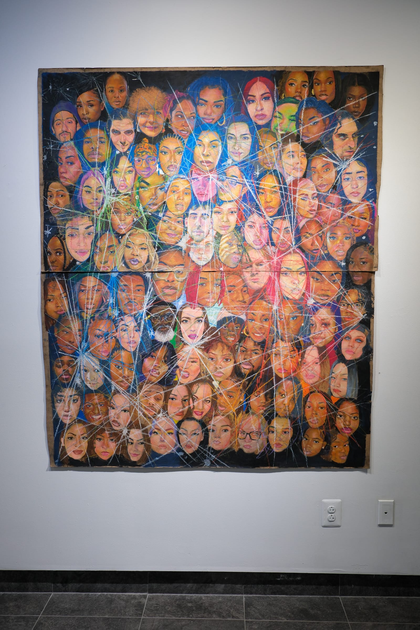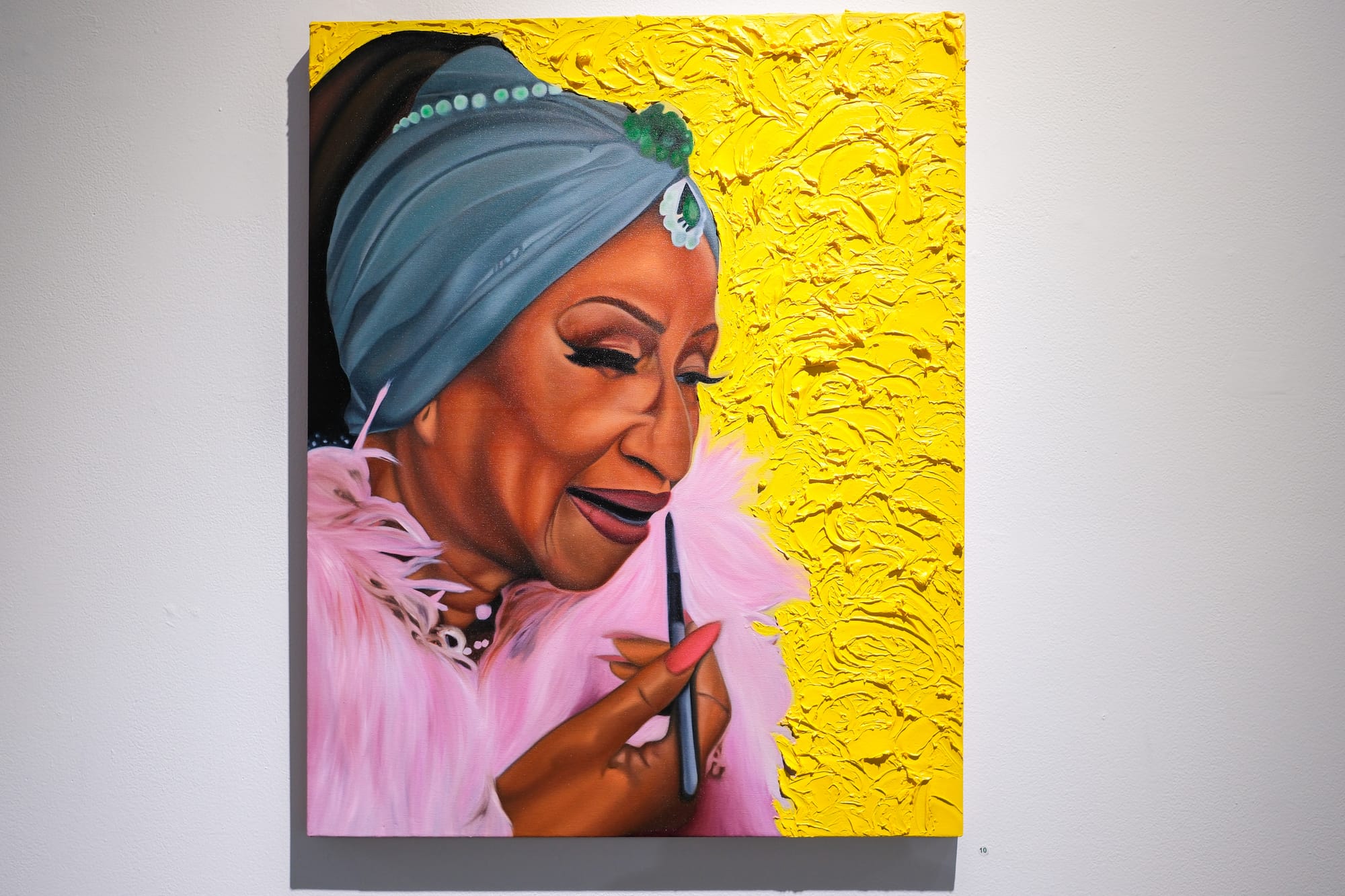 This drawing is displayed alongside works commemorating other Latine and African artists, like Nigerian musician Fela Aníkúlápó Kútì, whose art and activism inspired Charles Wright's oil painting "The World Wide Web” (2024), and acclaimed Cuban singer and civil rights activist Celia Cruz, who is memorialized in a portrait by Ingrid Yuzly Mathurin. Titled “Queen of Salsa” (2024), the painting features a color palette that pays homage to Cruz’s Yoruba practices, a spiritual tradition that the artist shares in common with the late singer.
