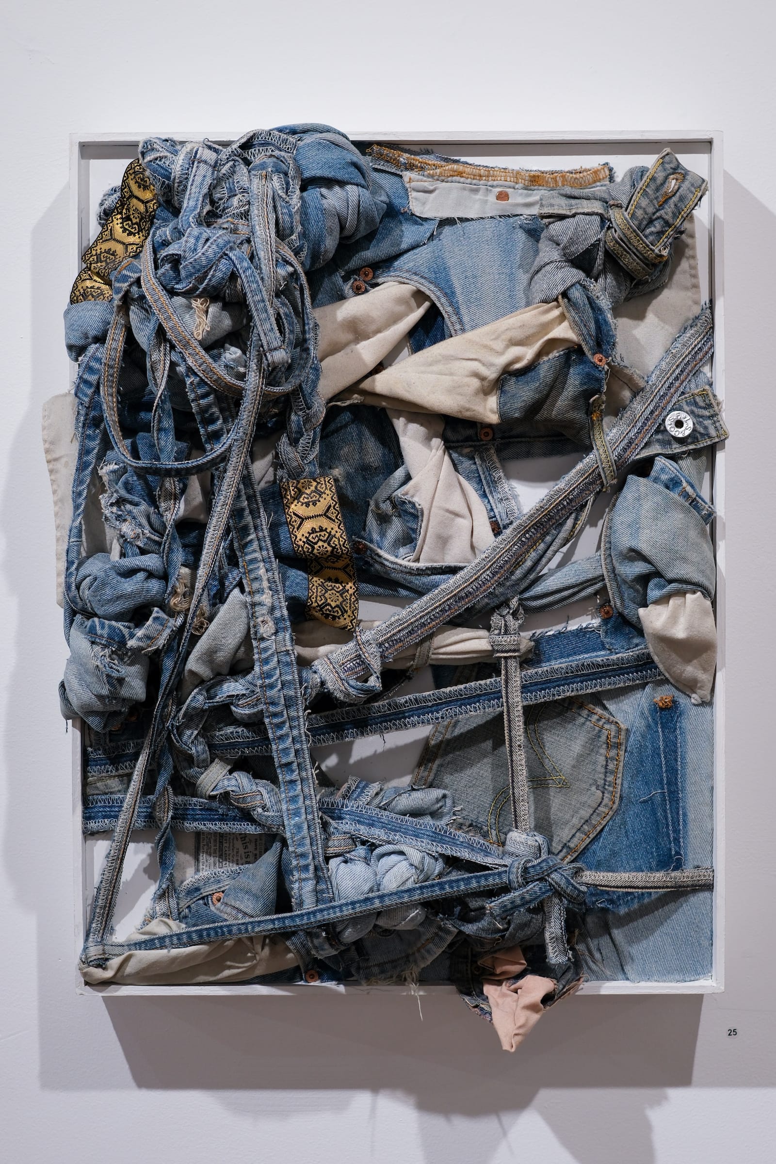 New York artist Teri Gandy-Richardson told Hyperallergic that she wanted to commemorate the history of the blues by addressing its connections to slavery. Her sculptural works "Squeeze" (2008), "Stir (Seven Years)" (2009-2020), and "My Grandmother's Crown" (2018), now on view at the Jamaica Center for Arts and Learning (JCAL) in Queens, all feature repurposed scraps of denim — a heavy-duty fabric historically dyed with indigo extract, historically obtained by hand by enslaved Africans.