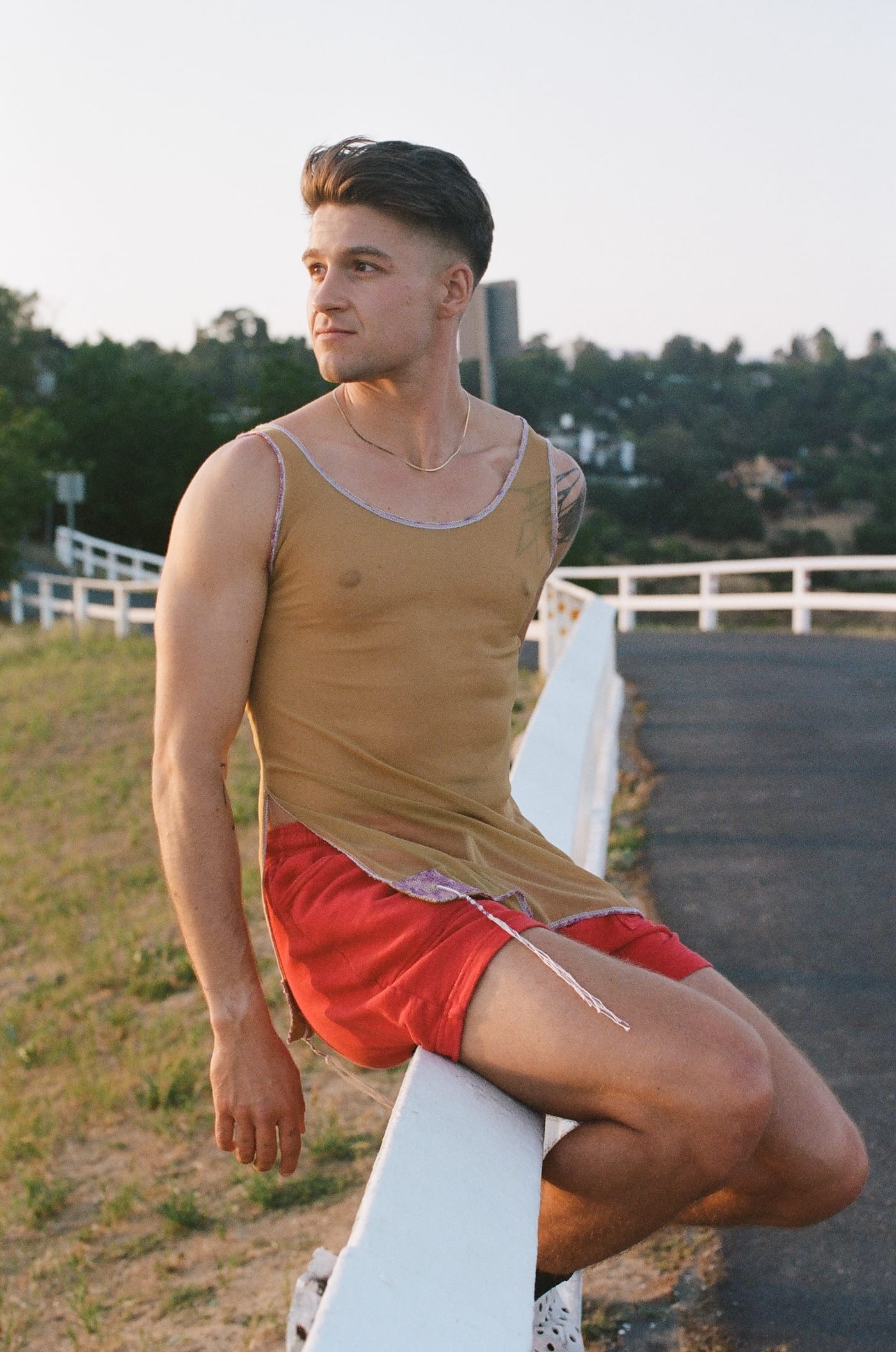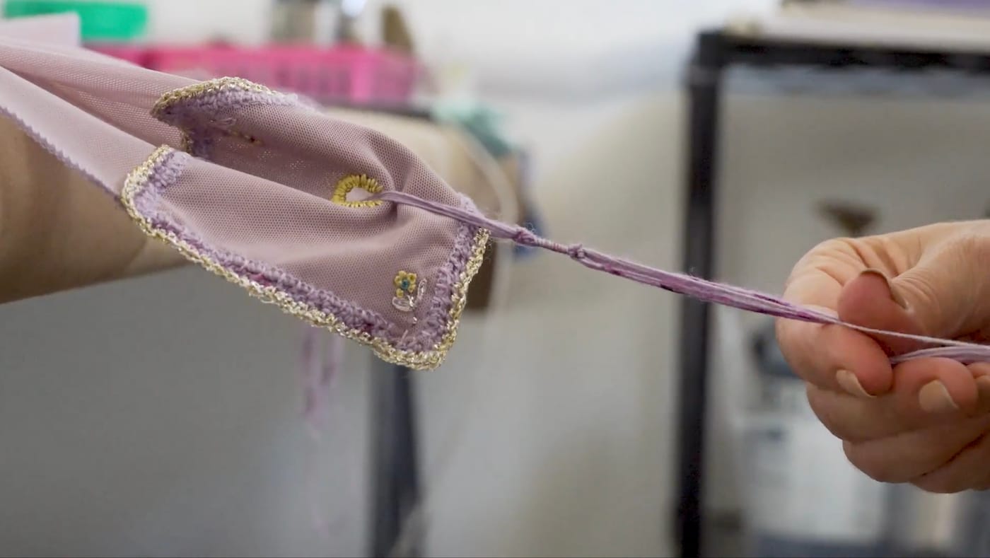 It was also important that their tzitzit were in keeping with Jewish law; namely, that they be kosher. There are various regulations regarding how and from what material tzitzit can be made. The bodies of the garments are made from deadstock nylon mesh at Ari Jogiel, a small fabrication company in downtown LA, with a focus on minimizing their ecological footprint, while the fringes are hand-knotted from Tencel, cotton, or wool. They recite the phrase “l’shem mitzvat tzitzit / for the sake of performing the mitzvah of tzitzit” as they twist and knot the strings. The wool is hand-spun by textile artist Channing Hansen, who also recites a prayer as he works. It is important that the yarn be made for the sole purpose of being part of tzitzit, and Hansen’s hands-on approach means that “from the raw wall to the spun yarn, it’s all done with intention,” he said.
