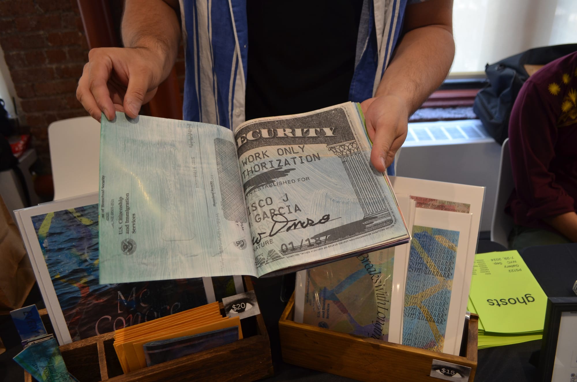 Francisco Donoso’s table turned heads, featuring prints of manipulated documentation from his Deferred Action for Childhood Arrival (DACA) proceedings. Donoso said he’s working on a 10-by-20-foot (~3-by-6-meter) painting overlaying these legal documents, but for the fair, he wanted to make them into a book.