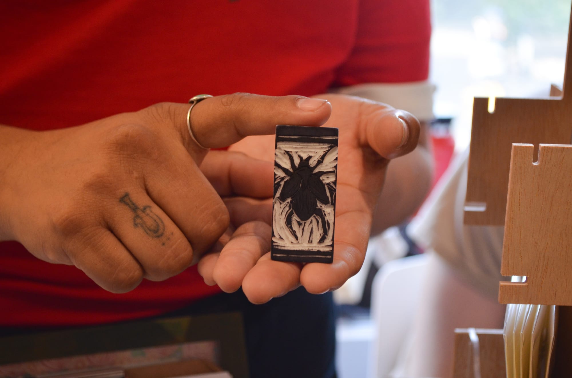 In a smaller display, Jessica Elena Aquino sold prints made from carved school erasers, drawing on her background as a teaching artist. She also makes cyanotypes of the landscape in her hometown Santa Ana, California. Her friend seated next to her was eager to tell me that Aquino is also bound for a residency at the University of Arkansas to work with corn husks.