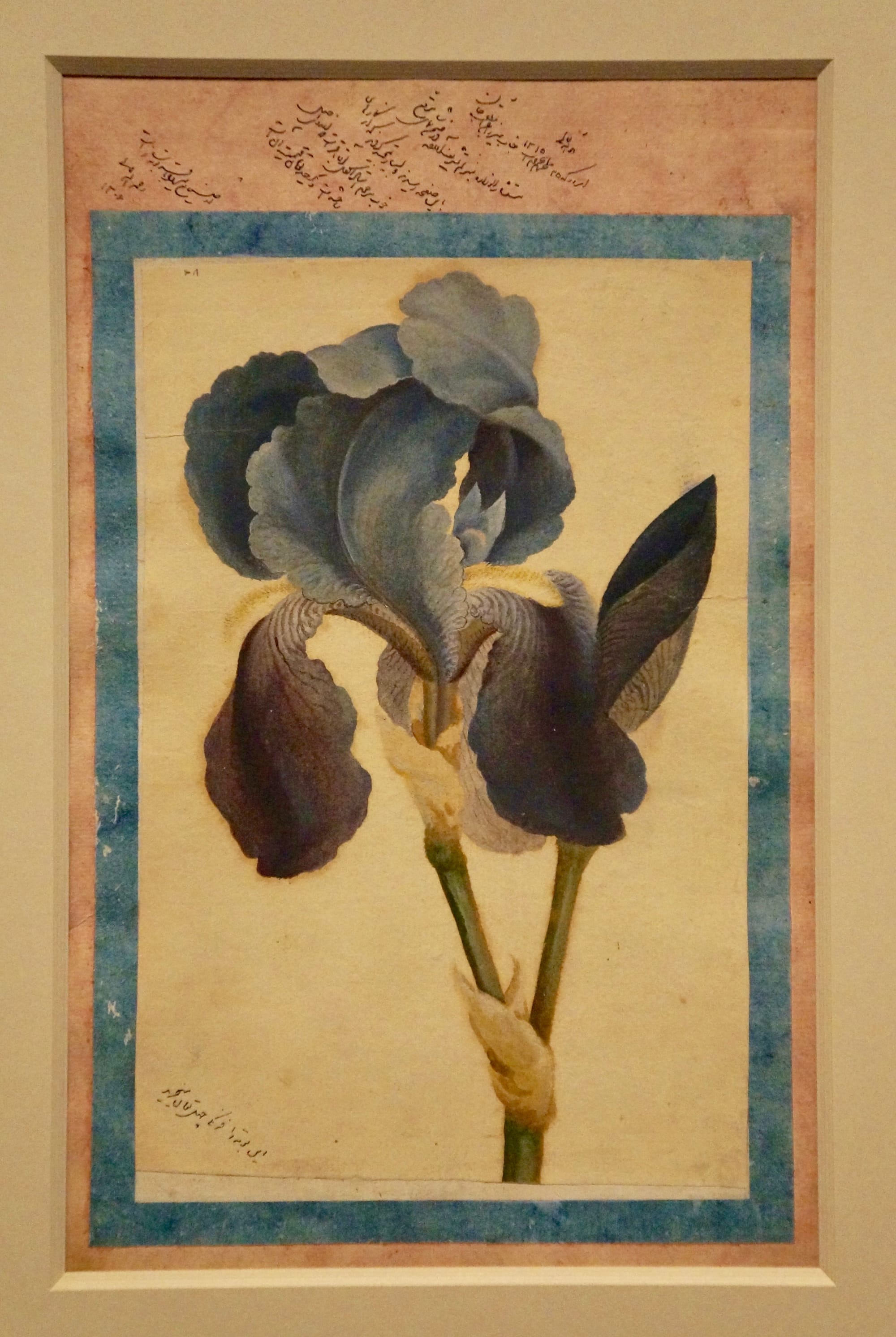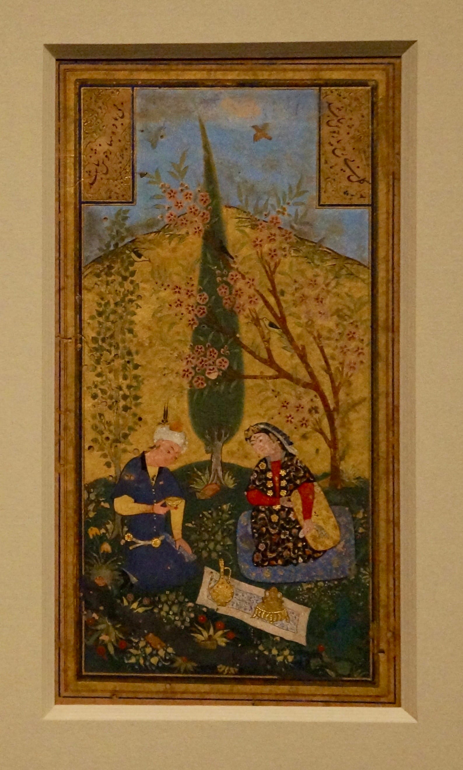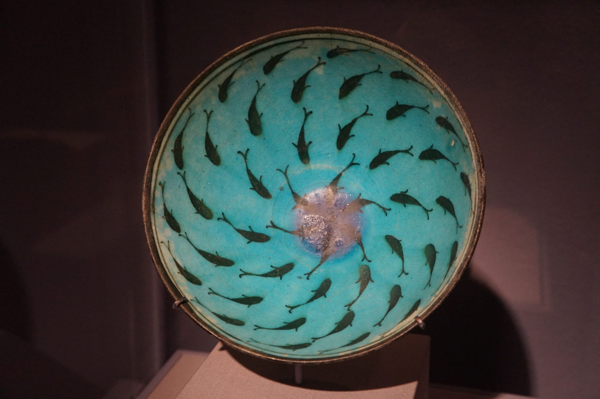The other works that fill out the Garden Paradise exhibition tie into the flora and fauna that one might associate with paradise. A 16th-century bookbinding shows a prince seated in a garden, surrounded by lush cypress trees, as others offer him a plate of pomegranates; the scene is edged with an intricately detailed gold border. “Persian paintings from the Safavid period (1502-1722) and earlier attest to the importance of the ancient ritual of holding court in an outdoor space — complete with portable luxury furnishings and wares,” the placard reads. Ceramics with variously hued glazes feature such motifs as flowers and ducks. A mesmerizing late 13th-to-mid-14th century stonepaste bowl with a turquoise glaze depicts black fish swimming counter-clockwise into a deep blue center.