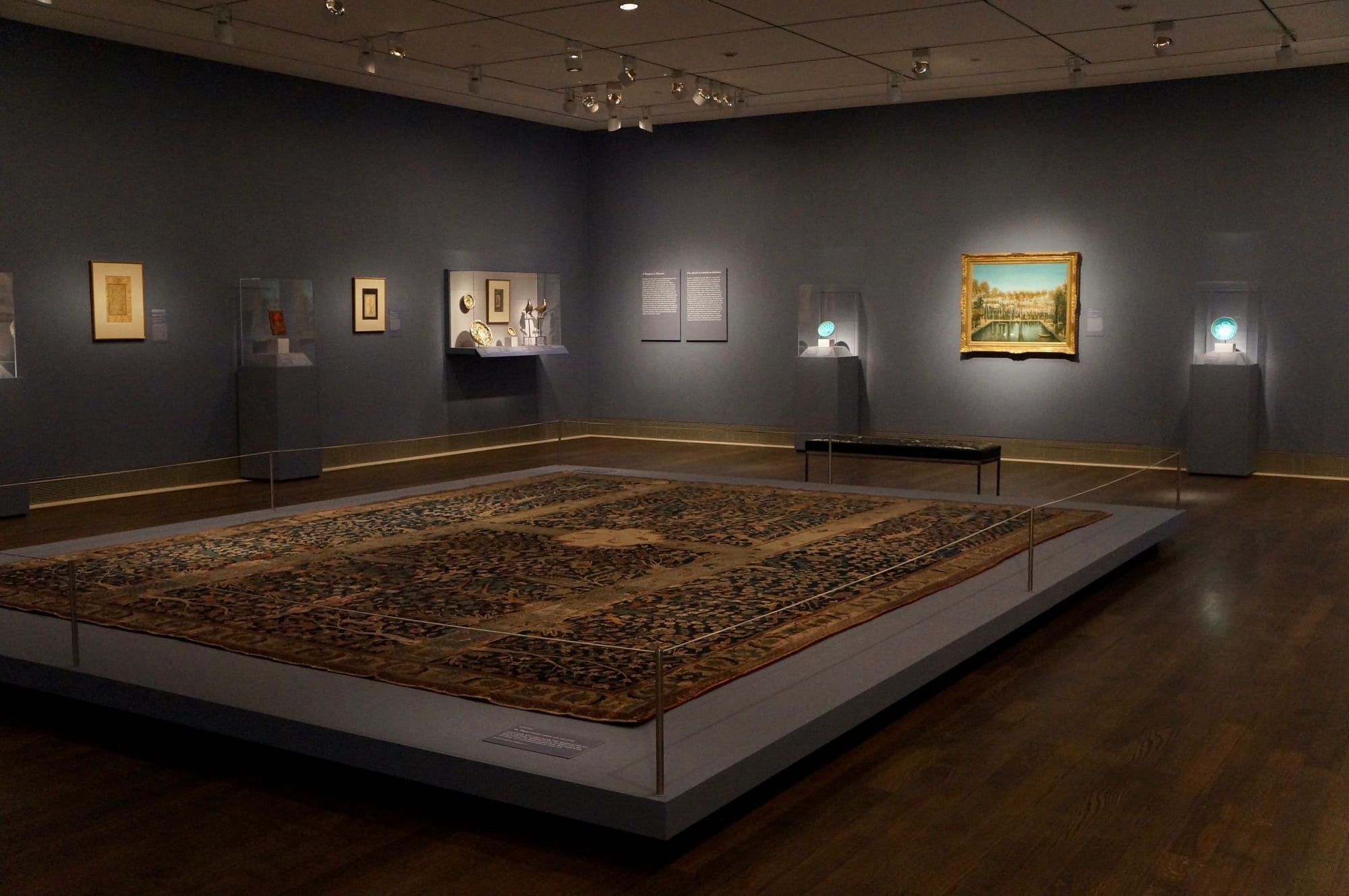 Incidentally, how visitors walk through the exhibition is as varied as how they might walk through a pairidaeza. Some march through quickly, pausing for a selfie, on their way from the Antiquities to the American West rooms. Others meander their way around, stopping to look at the ceramics and watercolors, constantly turning from the works that line the wall to the carpet. Walking around such a textile literally creates different points of view.