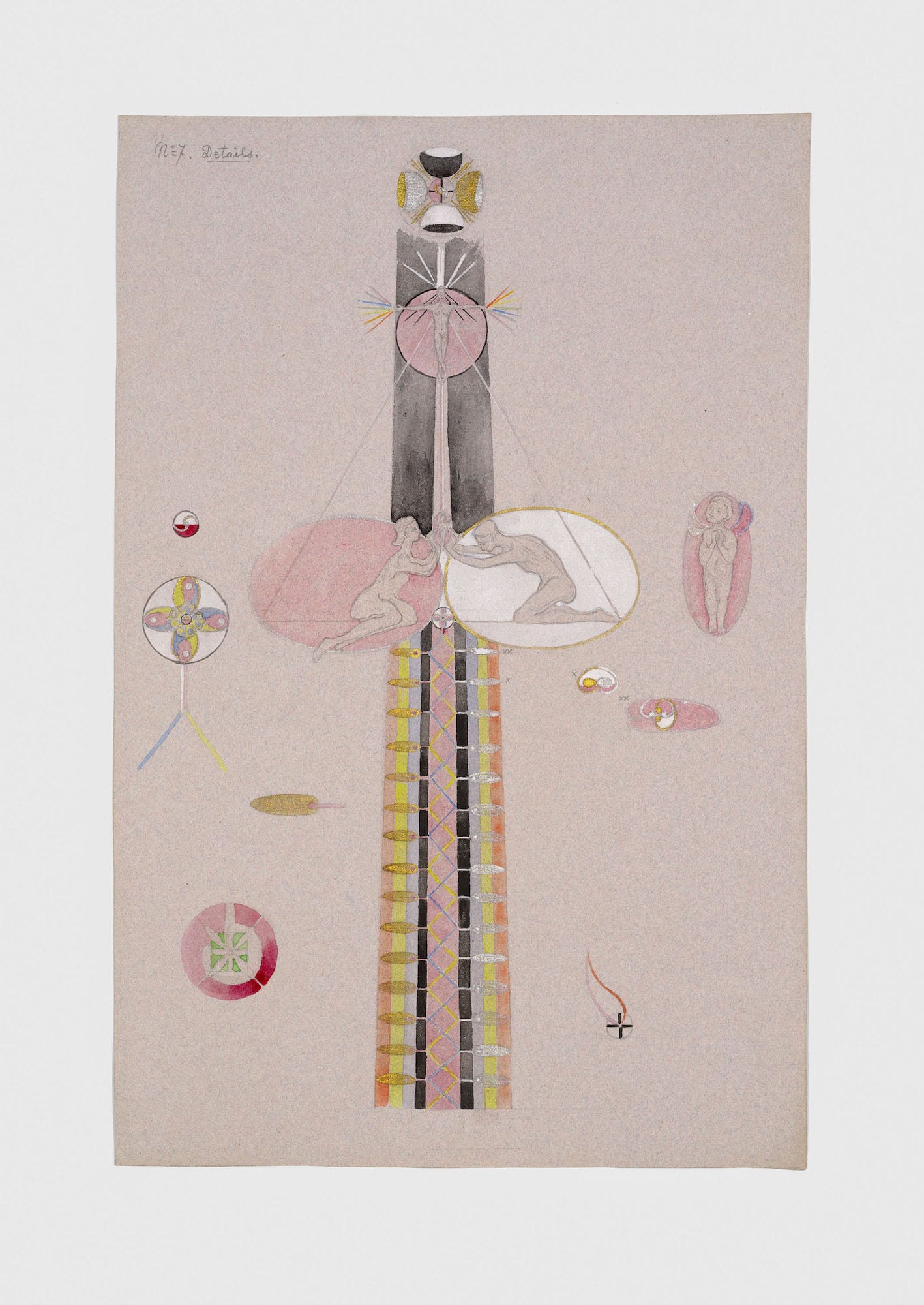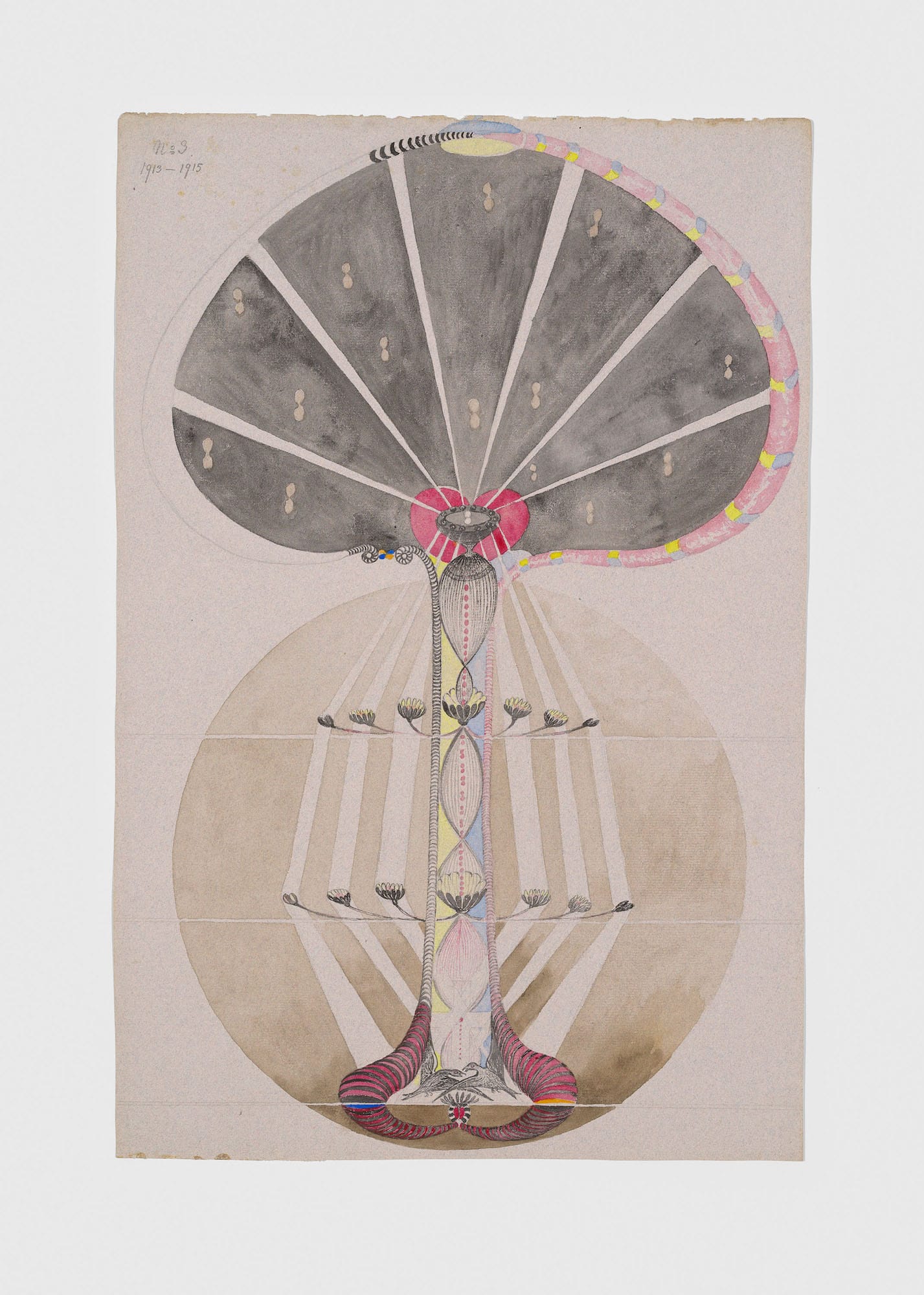 Af Klint typically melded iconography from established religions, including Christianity and Hinduism, with unique motifs culled from her personal inner life and experiences, such as the Spiritist séances she partook in as a teenager.Each intricate design in theTree of Knowledge series, rendered in watercolor,gouache, graphite, and ink, is a variation on the same pictorial theme, a tree with a heart-shaped crown. Incorporating biblical allusions to Genesis as well as organic forms and ornate details, they imply a symbolic progression from innocence to the Fall from Grace, as Åke Fant, an early scholar of af Klint, notes in his 1989 account of her life and career.Created between 1913 and 1915, the suite of watercolors overlapped with af Klint's Paintings for the Temple (1906-1915), a group of 193 worksthought to be among the earliest abstract paintings in the Western canon whose imagery was conveyed to her through a medium.