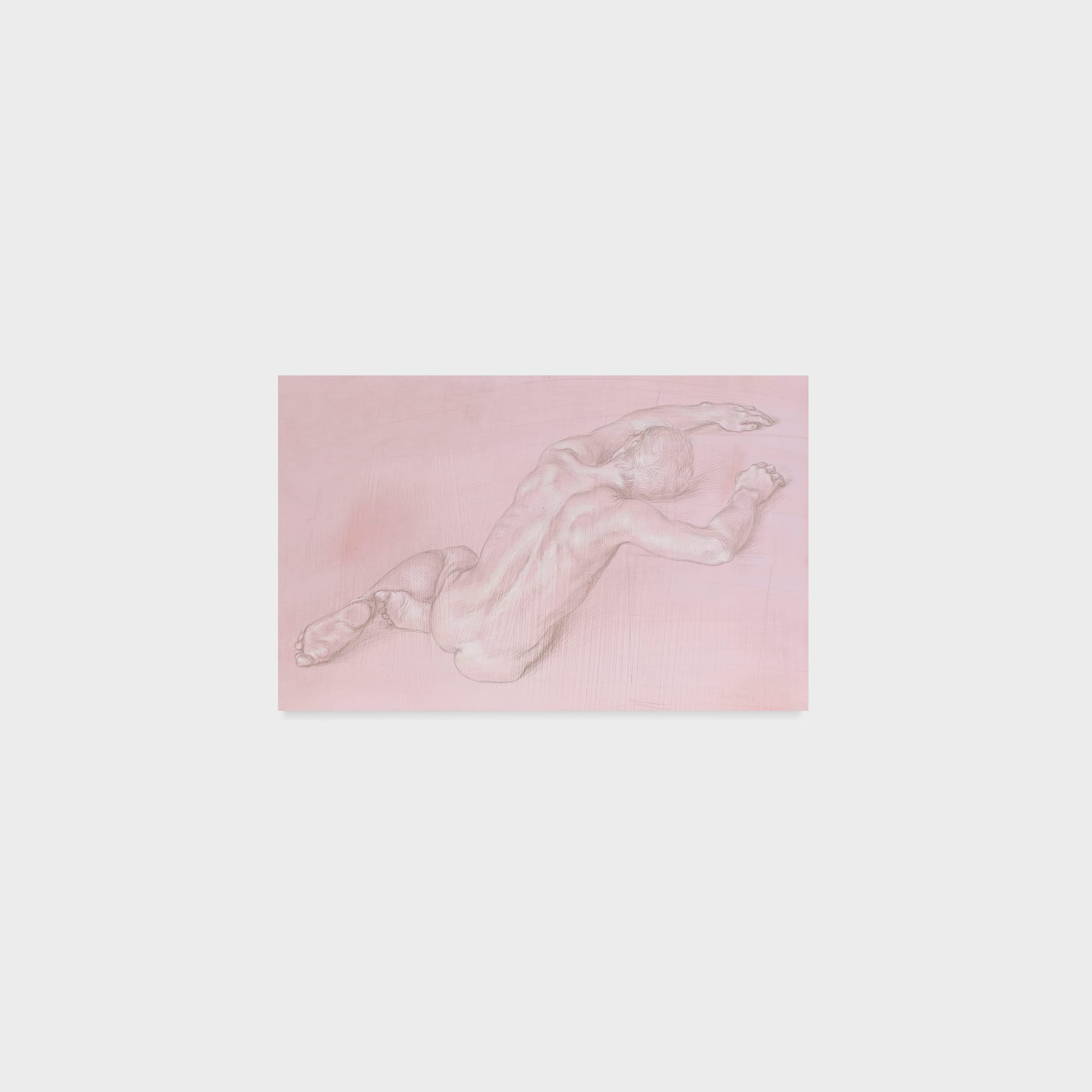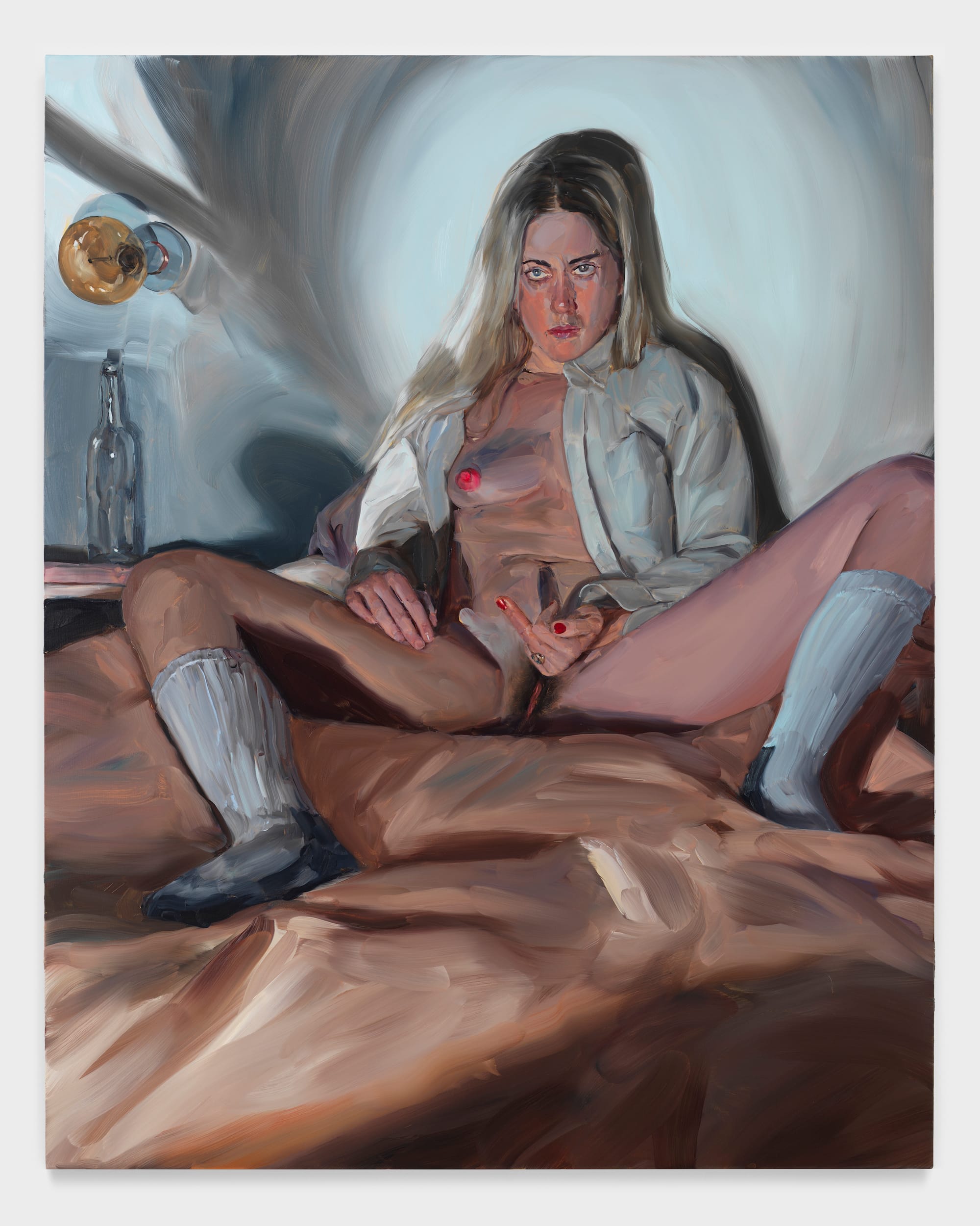 Jenna Gribbon’s “Demonstrative (in our bedroom with spotlight)” (2023) is more forceful in its messaging: a blond model spreads her legs open as she covers her sex with her hand, flipping off voyeurs. As a queer female artist, Gribbon has sought to put more pressure on the viewer through body language, eye contact, and lighting. In the work on view, the figure confronts us, as if to ask, “What the fuck do you want?”