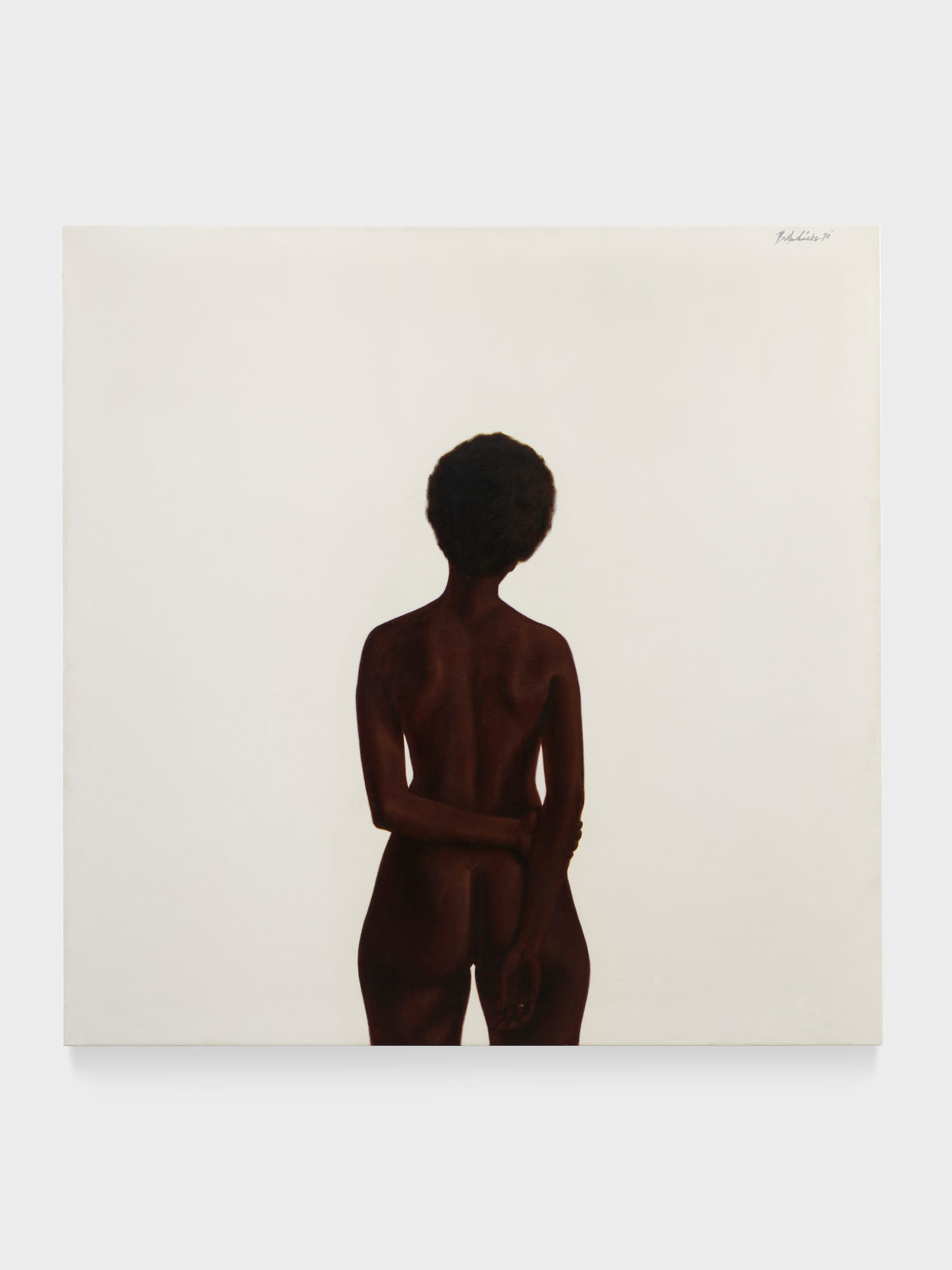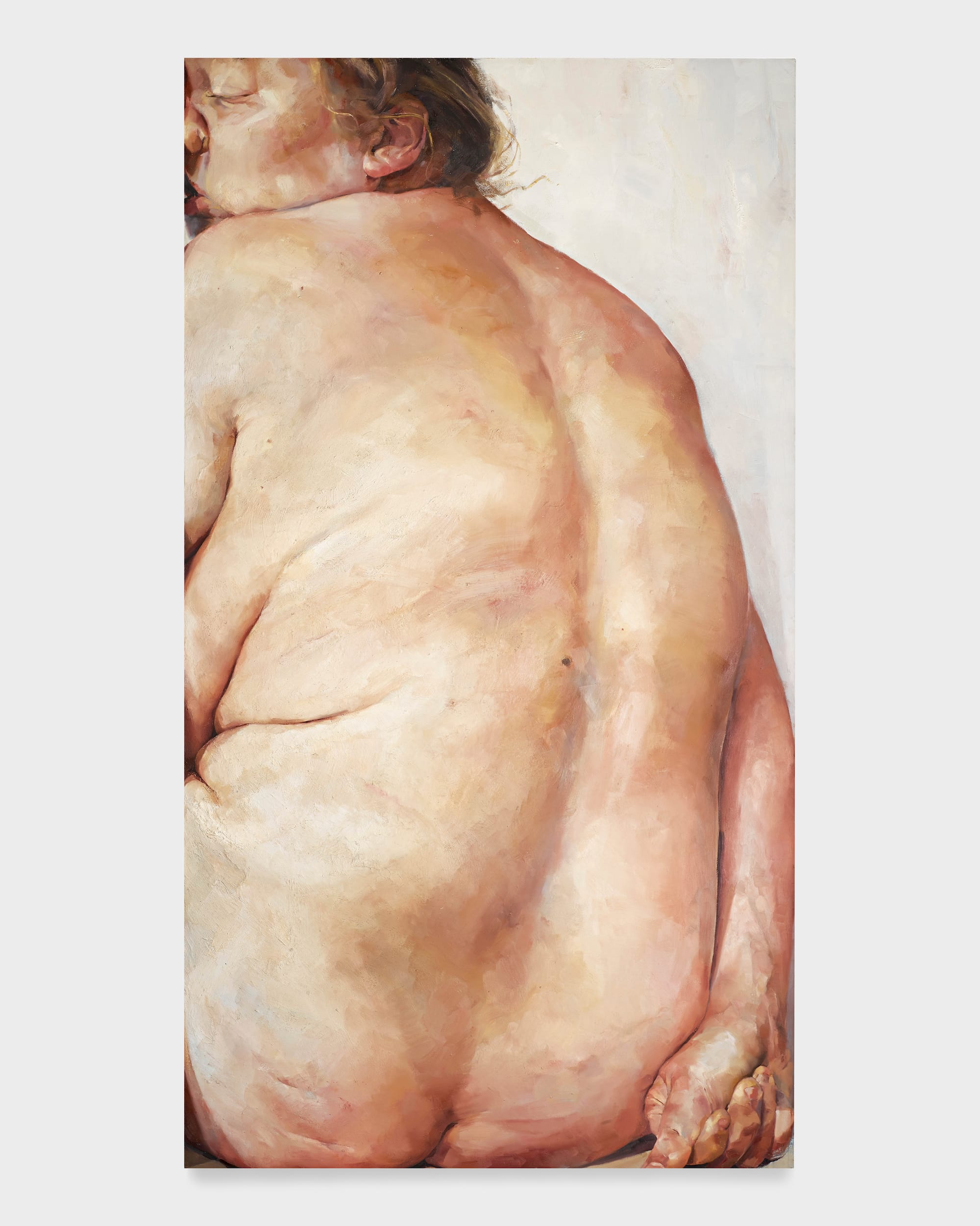 Viewing a painting of a nude is an intimate experience. Take John Currin’s “Nude in a Convex Mirror”(2015). The round shape of the canvas is highlighted by the curvaceous, milky white buttock that takes up the majority of the picture plane. Currin’s use of Rückenfigur, a conceptual and formal device in which artists deploy the human figure as seen from behind, reconfigures an idealized odalisque into an all-knowing woman, who looks over her shoulder at us, as we observe her. She asserts her dominance through her awareness of our gaze, and as Alison Gingeras denotes in her essay for the exhibition, that is key to being a bad ass.