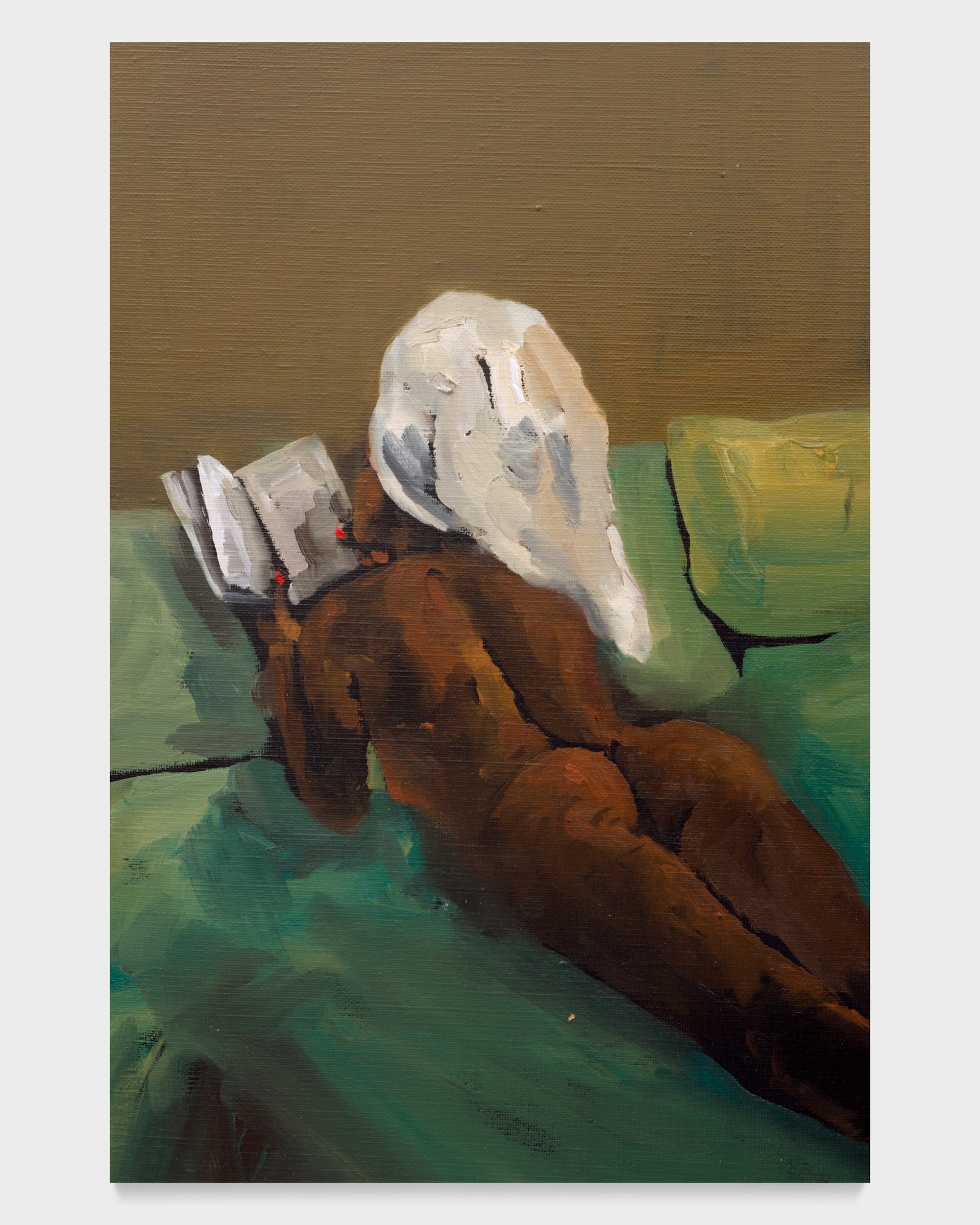 The female gaze directed at female bodies is evident in about 10 works on view. In Danielle Mckinney’s “Lost in Translation” (2023), a foreshortened, Black female nude lays on a green bedspread, her hair wrapped in a towel, as she leafs through a book. This image of leisure, without concern for the observer, reclaims the art historical trope of the reclining (White) nude and repositions it through the lens of a modern Black woman’s experience.