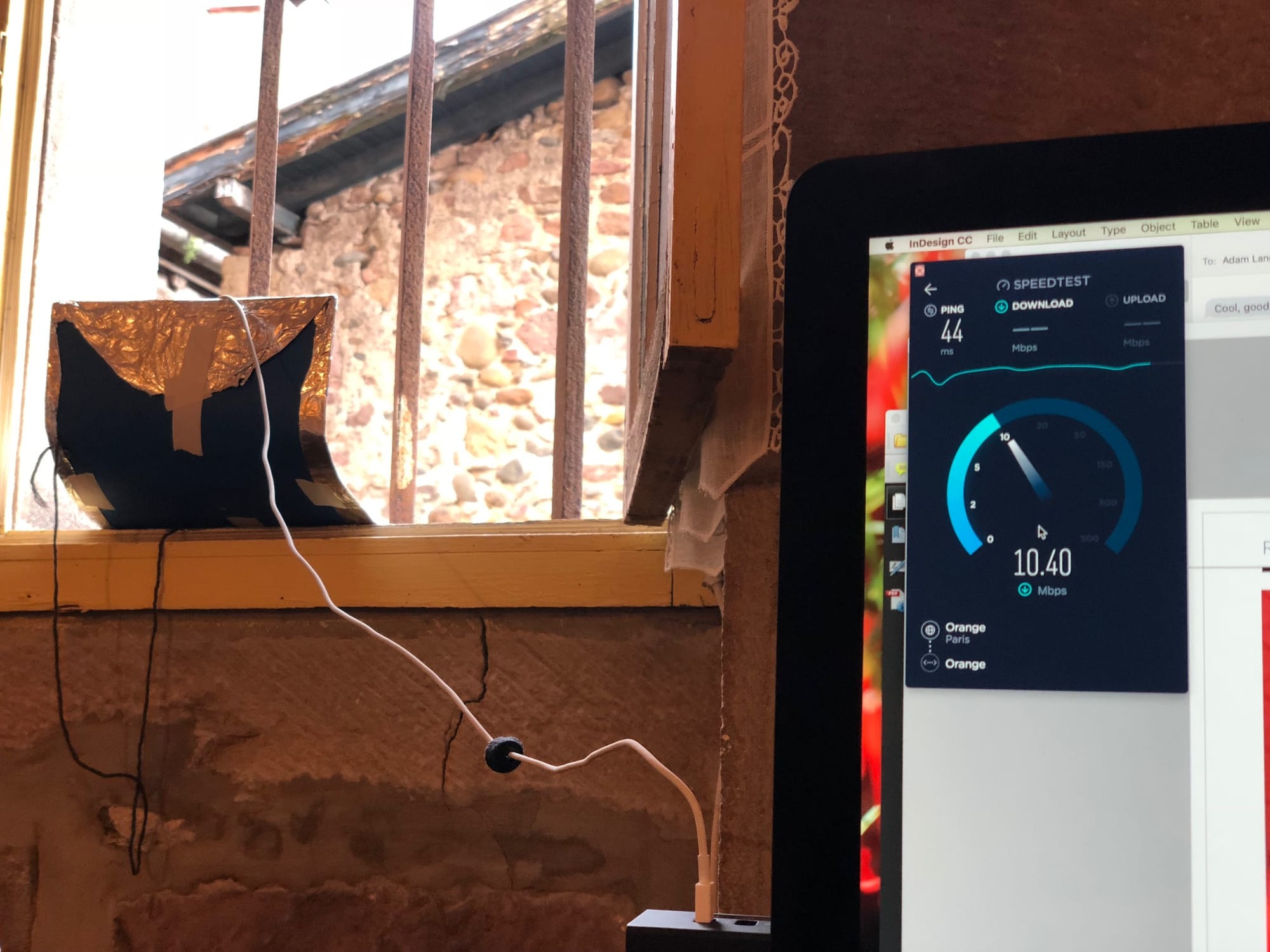 When I do need to work in my second story dungeon and access the internet on my computer, I tether it to my French iPhone and use my plan’s cellular data. Getting enough reception to make this happen isn’t easy. But I went to art school, which means I’m all about problem solving, right? So I made an antenna dish of sorts by wrapping a file folder with aluminum foil then taping it to form a curve. Then I taped my phone to the surface of the aluminum inside the curve and perched it outside my window. I downloaded a speed test app to see which way the dish should point. Luckily there are iron bars on my window that will keep my dish from falling off the windowsill and into the rubbish bins of the restaurant next door. Charming.