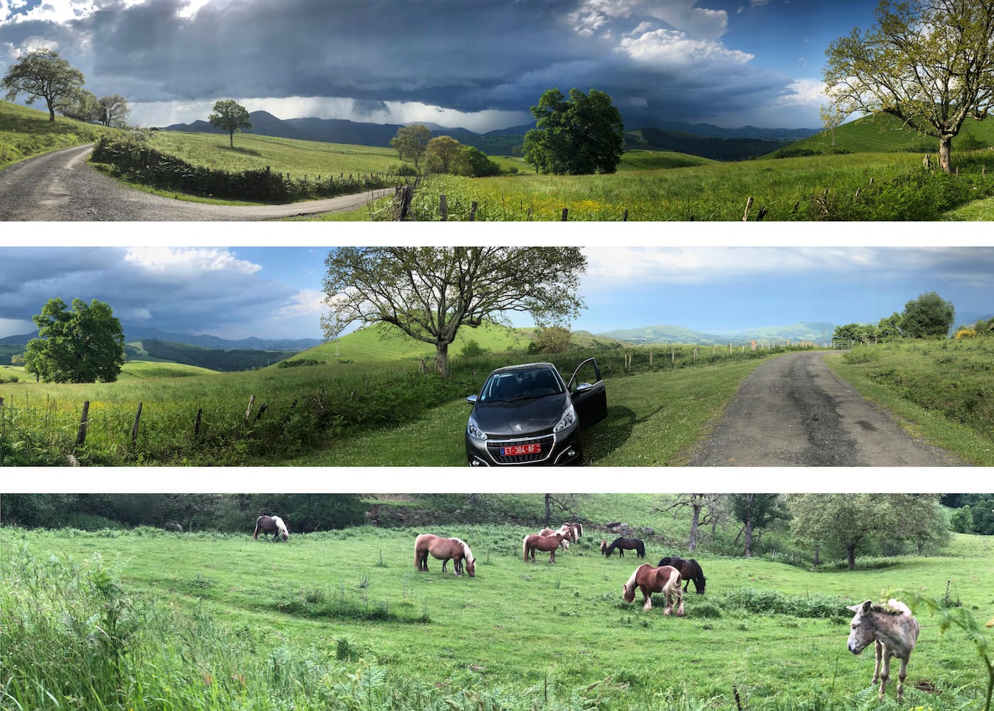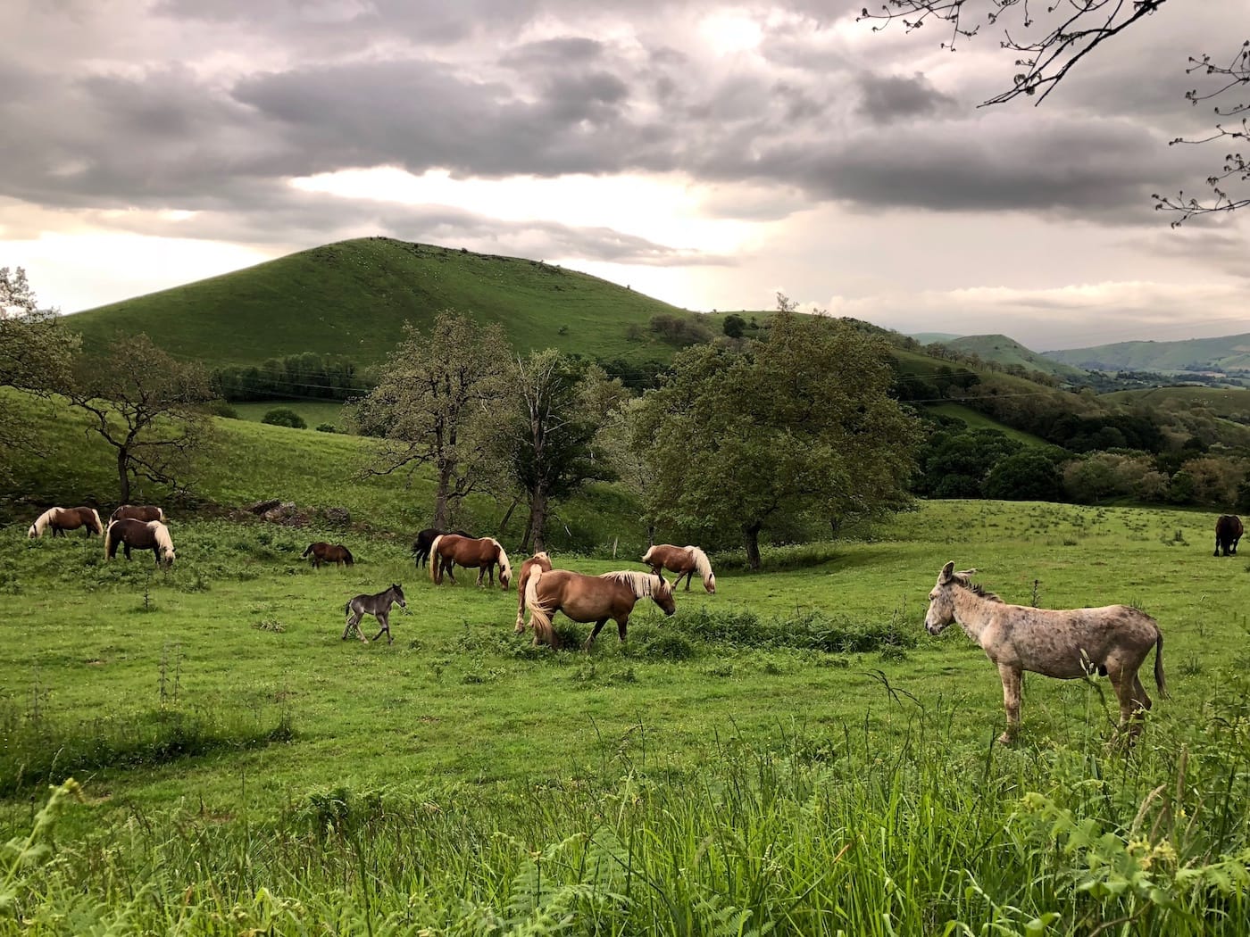 The wind picks up now and then, slightly rocking the car. I take a break to check Facebook. The crickets are too loud. I can hear the clank-clank of cowbells on the cattle on a far hillside — so small they look like burnt popcorn. I can hear the braying of one of the donkeys in the horse pasture about 200 meters down the hill — I passed them on the way up. I’ve just called my dad in Florida. And normally I would sit up here and write a bit more except I’m hungry. I should return to the bat cave.
