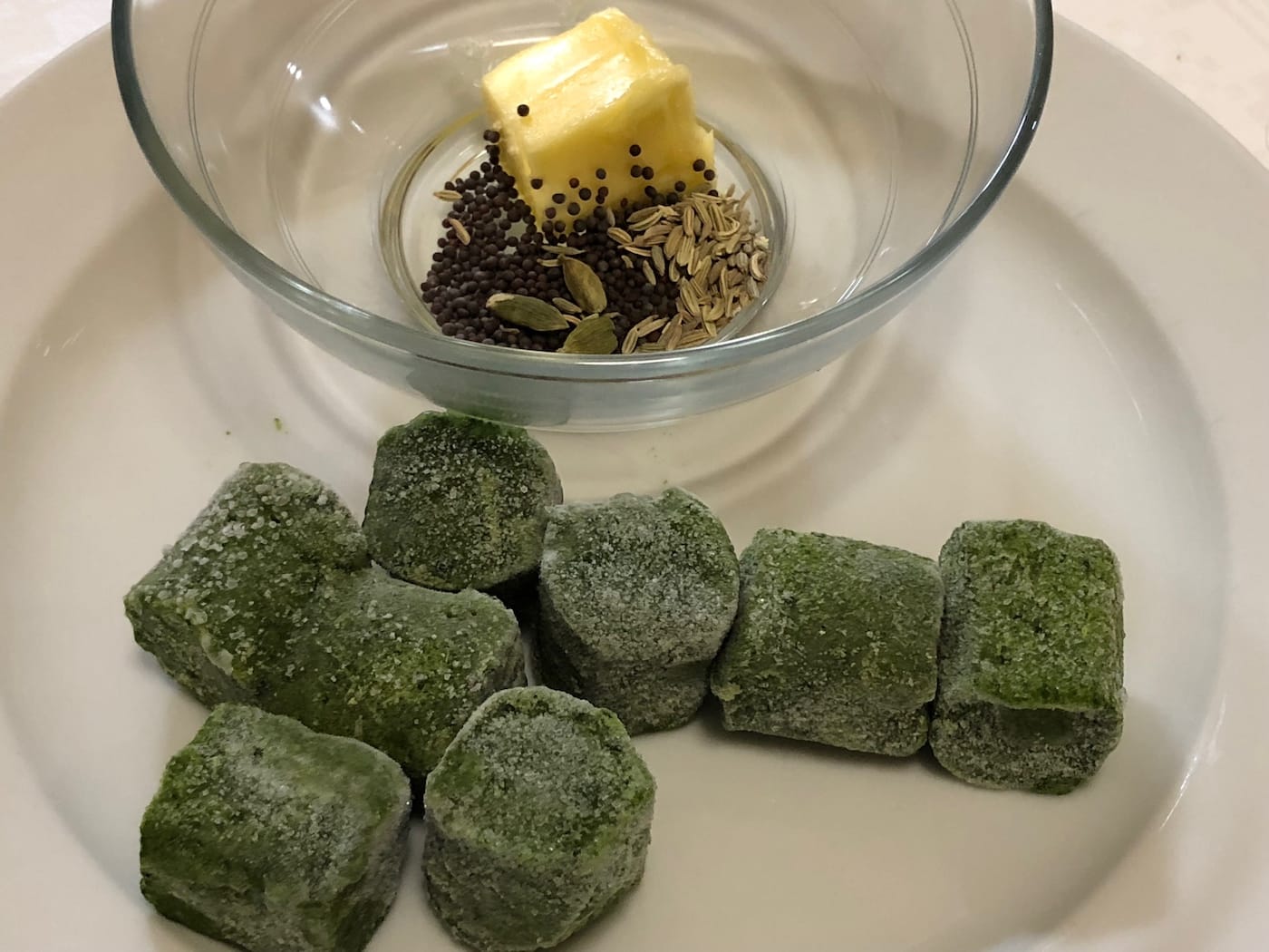 Put butter, mustard, fennel and cardomon seeds in a microwaveable bowl. Cover with a paper towel and microwave for 60-90 seconds. It will be ready when the butter foams and begins to brown and the mustard seeds might begin to pop. But don’t let it burn! Add the frozen spinach to the bowl and continue to microwave for 3 minutes.