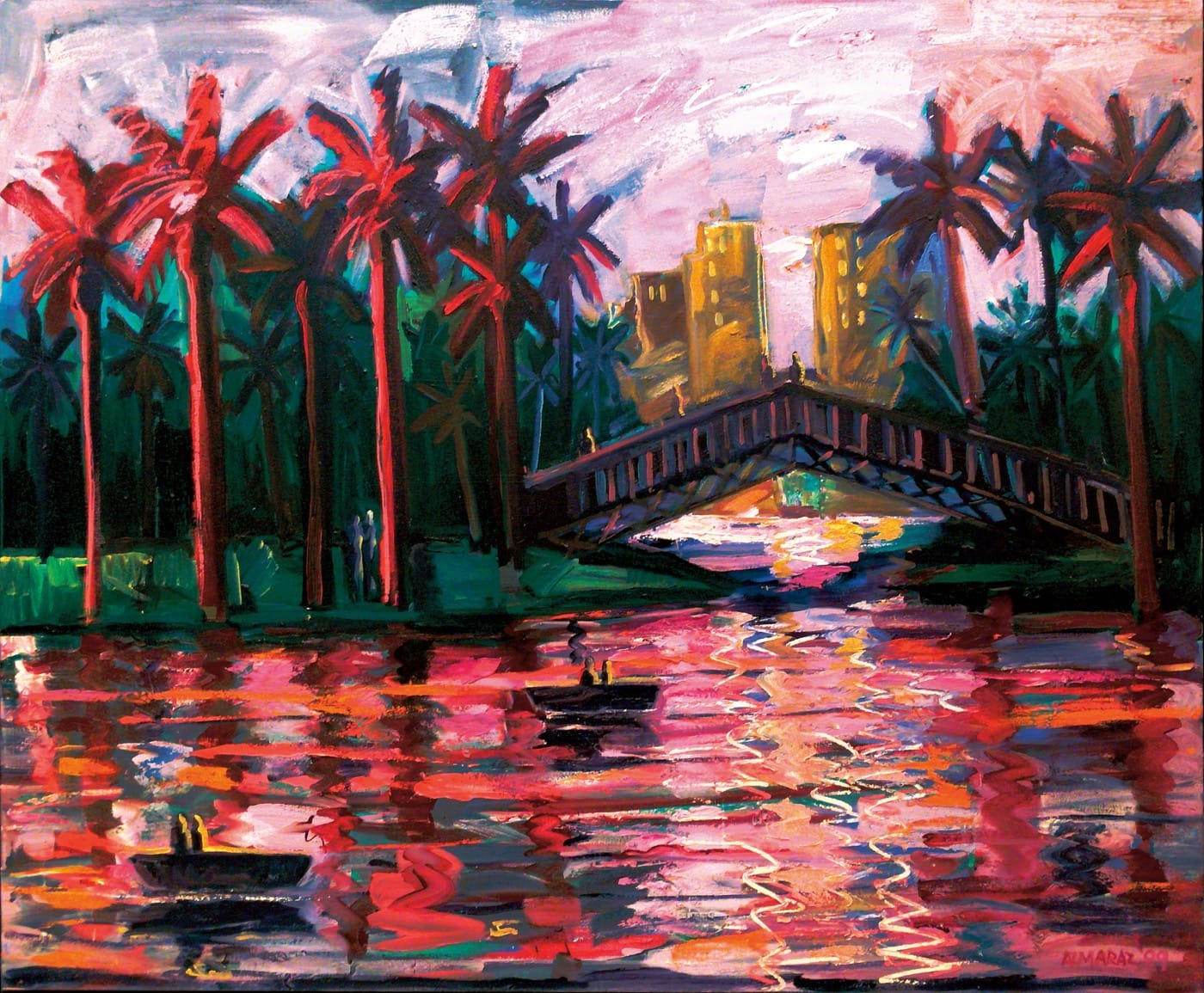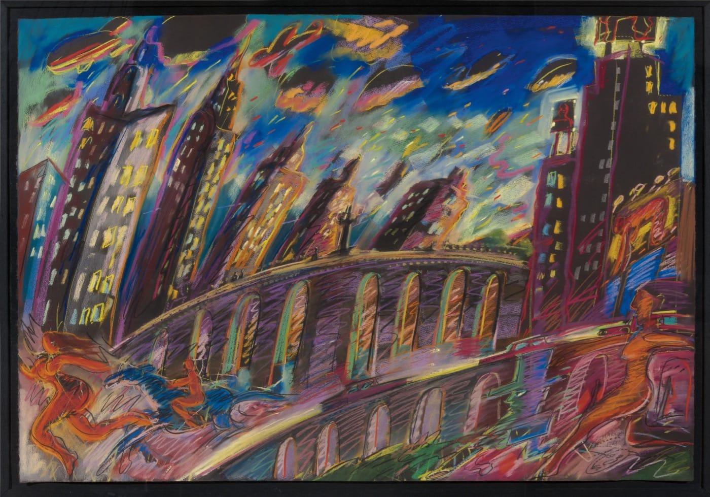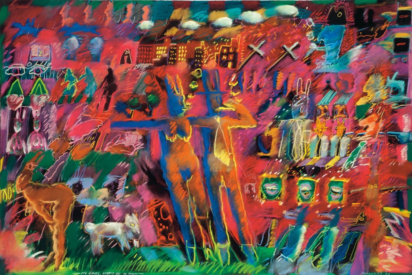 Echo Park in the 1980s, as depicted by Almaraz in works like “Mr. and Mrs. Rabbit Go to Town” (1982) was a scenic, urban oasis that provided reprieve from the hustle and bustle of the surrounding city. With an amalgamation of vivid hues and ragged strokes that burst with visual energy and activity, this painting is a city dreamscape, a seductive and mysterious ode to a city that Almaraz had a contested relationship with.