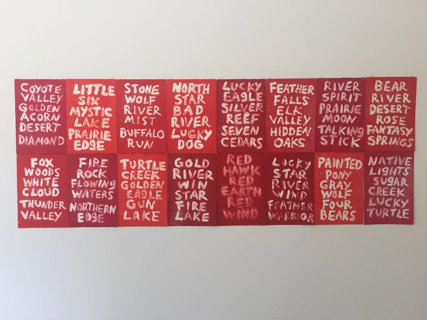 For his “Sovereign” monoprints, Heap of Birds takes on Native American casinos. He doesn’t offer commentary, but lets the listing of the names of such establishments offer it’s own opportunity for debate about the value of sovereignty and the ownership of income-generating institutions at the cost of societal ills such as gambling and alcohol addiction. The piece also recalls Heap of Birds’s earlier “Telling Many Magpies, Telling Black Wolf, Telling Hachivi” piece, by showing ways in which Native culture gets commodified to attract non-Native customers.