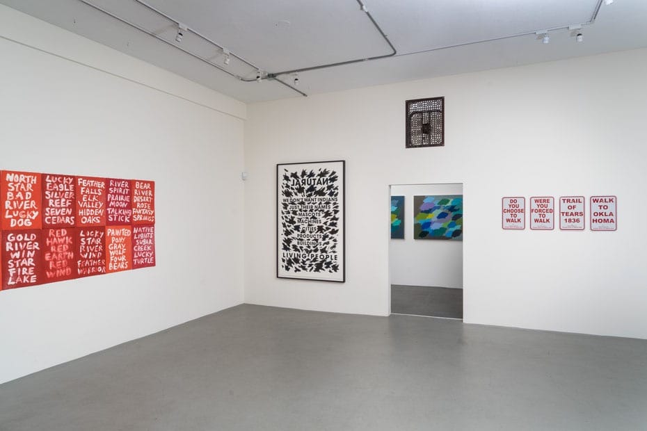 MINNEAPOLIS — The Bockley Gallery currently has on view a mini-retrospective of the work of Edgar Heap of Birds (whose Cheyenne name is Hock E Aye VI), which contains examples of different bodies of work the Cheyenne/Arapaho artist has created over his extensive career. With public art pieces, biting political, text-based work, and more intimate abstract paintings, the small exhibition carries a pummeling point of view, illuminating Heap of Birds’s expansive career.