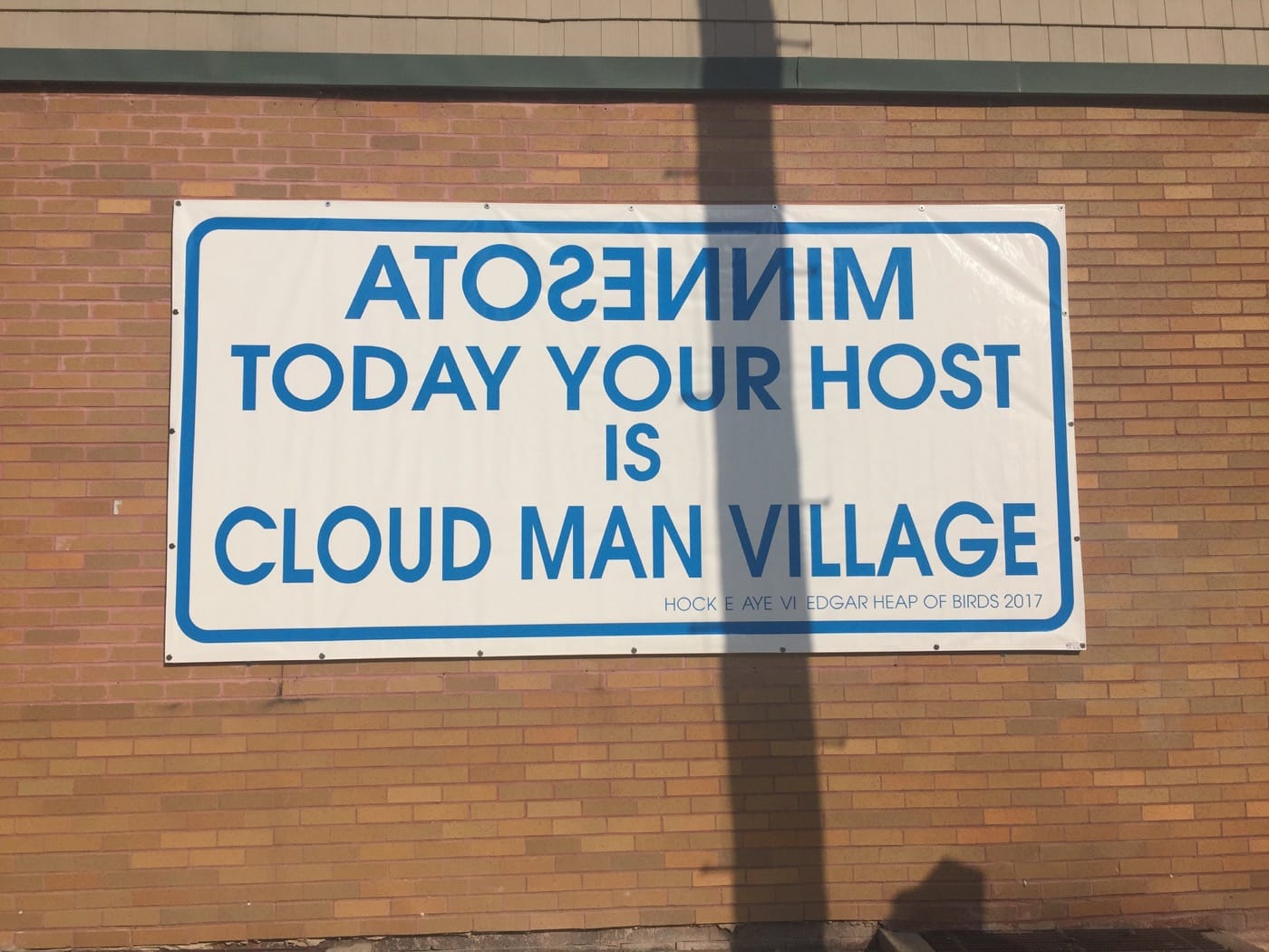 According to Bill Anthes’s book, Edgar Heap of Birds, the artist began his “Native Hosts” series back in 1988. Like the new commission displayed outside Bockley Gallery, the “Native Hosts” contain the “settler” name of a place written backwards, with the Native Host spelled forward, welcoming the viewer. Like many place names around the country, Minnesota is a derivation of a Native American word (“Mní sóta” means clear blue water in Dakota), but its appropriation by a state responsible for many atrocities against Native people warrants Heap of Birds’s critical treatment. Cloud Man Village, meanwhile, was a short-lived community led by Dakota chief Cloud Man, on the banks of the Bde Maka Ska lake in the heart of Minneapolis. After leading the community for 10 years, following the Dakota war, Cloud Man was later imprisoned at Pike Island where he died.