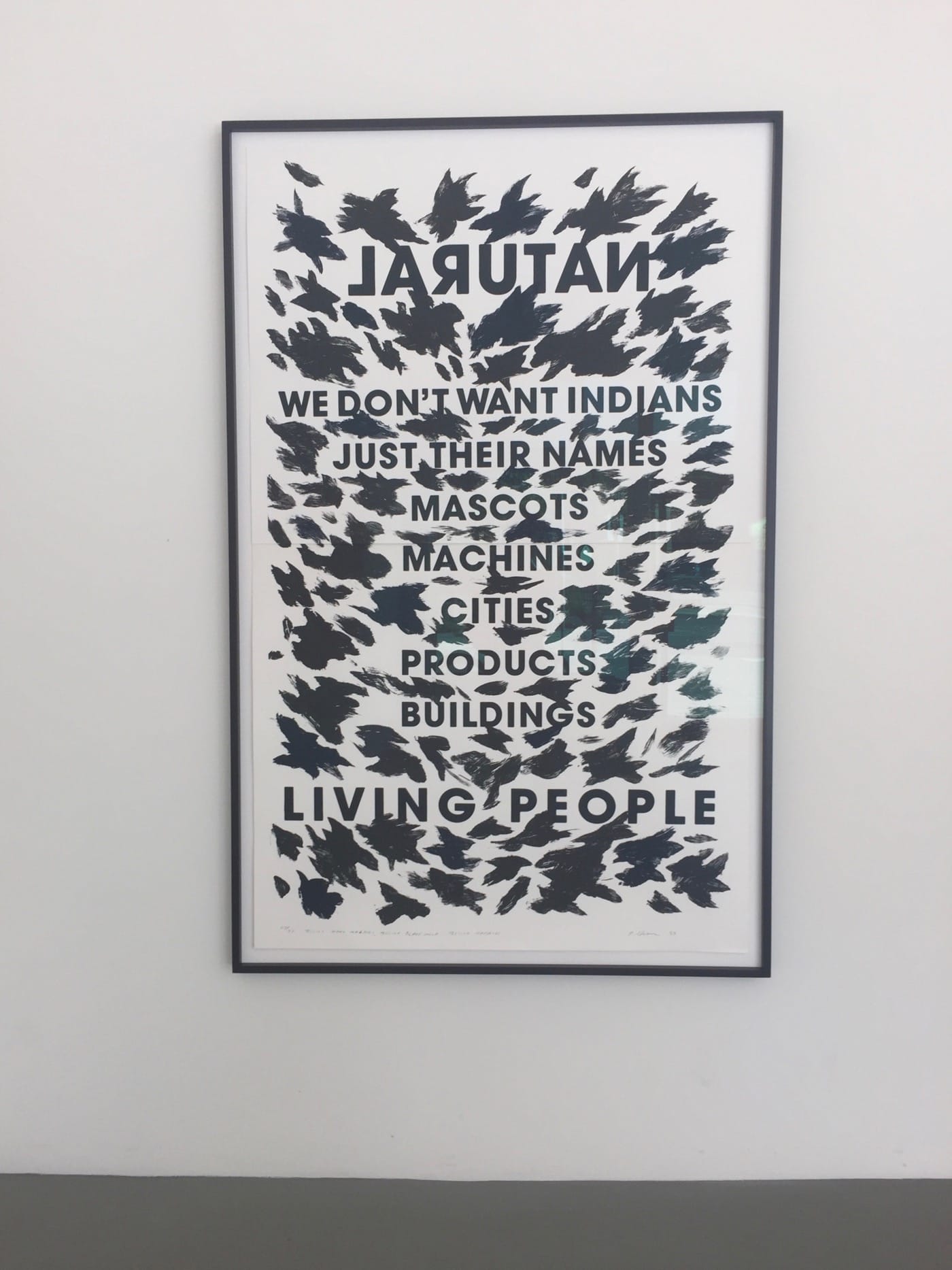 Inside the gallery are works from 1989 to 2017. The oldest, “Telling Many Magpies, Telling Black Wolf, Telling Hachivi” (1989), is a screen print that makes a political message that’s as relevant today as when Heap of Birds created it. Like the “Native Hosts” series, the artist writes the top word backwards. In this case, the word is “Natural.” Beneath it is the text: