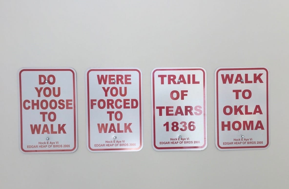 In the “Ocmulgee” series, the text once again reads like minimalist literature. The four works, originally installed outdoors in a posh Atlanta neighborhood, according to Anthes, look like road signs. They are strung together as if stanzas of one poem mourning the “Trail of Tears” walked by the Southeastern tribes of the United States, following the Indian Removal Act of 1830. Seemingly unassuming, these pieces are rife with the anger of a people who have not forgotten the harm done to them.