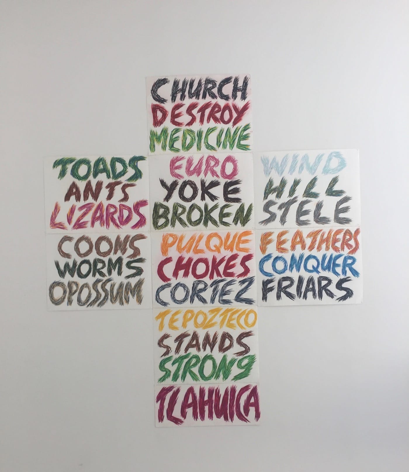 While the “Magpies” piece critiques stereotyping Native people, other works offer more specific messages. “Cross for Tepoztlan” (2009) for instance, arranges nine pastel text drawings into a cross. The words the artist uses poetically refer to the destruction of a culture by the Spanish, when they conquered and colonized the Tlahuica nation in what is now Morelos, Mexico. The words are sparse, but keenly chosen. “Church Destroy Medicine” reads one drawing, the letters created by furious slashes with a pastel.