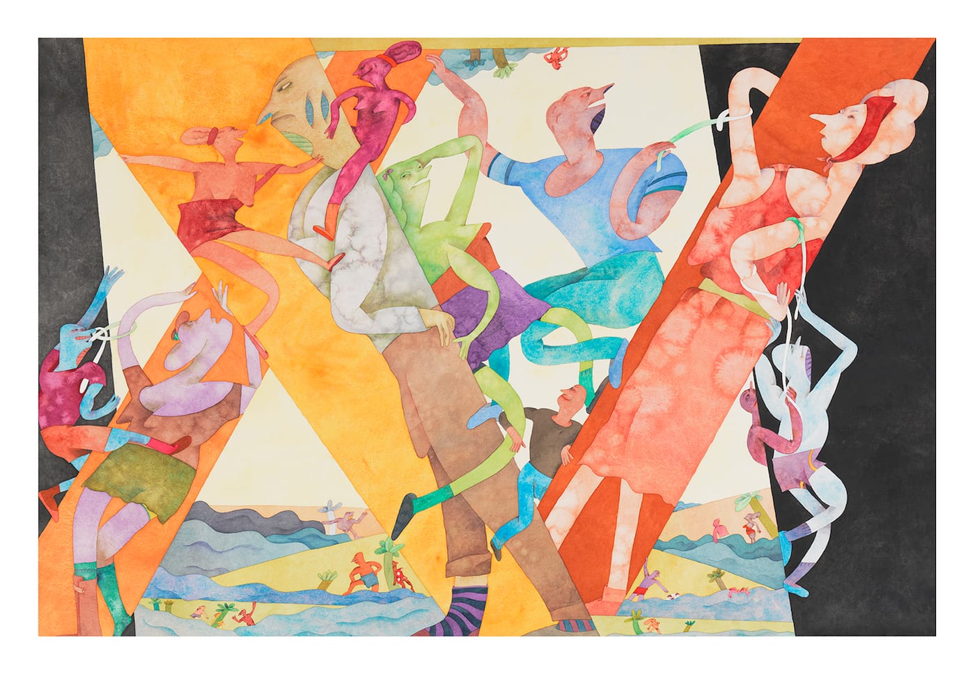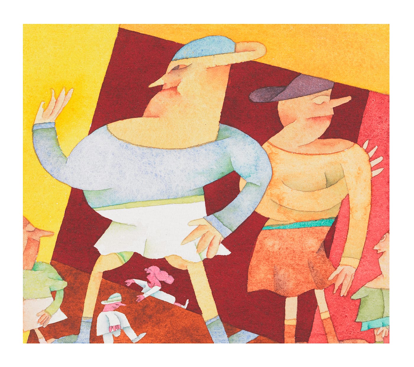 Look at all the different things she does in “Leger Faire.” What about the way the color of the largest figures’ clothes and skin are mirrored by their counterparts? Look at the man and woman in their respective triangles, which are formed by the beams of the house frame’s pitched roof: Their poses complement each other, and you don’t need to be a rocket scientist to guess what that look they are giving each other is conveying. Once you notice the various links — through color, for example — you begin to look for the differences. This is Nilsson’s genius. She knows how to keep the viewer looking in ways that are both pleasurable and challenging. Her mastery of watercolor is unrivaled. She can go from mottled shapes to evenly colored areas and make it all seem so easy.