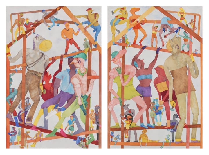 In each sheet of Nilsson’s diptych, bevies of carpenters (varying from oversized to diminutive) are working on a house frame. All the carpenters in the left panel are men, while all the ones in the right panel are women. The verticals and diagonals formed by the house frame serve to section off the watercolor, effectively establishing discrete zones of different shapes and sizes. The four largest figures occupy the largest zone, and those gathered on different beams just above and below them are considerably smaller, as if they are further way. The scale shift evokes perspective and space.
