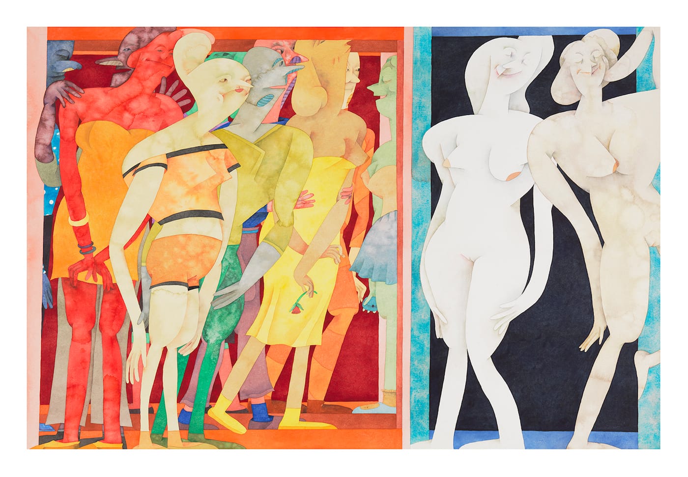 There are clusters of figures in each sheet, forming little groups within the overall group, like what happens at a party. The men are bald and many of them have huge conical crotches, as if they are wearing codpieces under their pants. In this and other details, it is clear that Nilsson has drawn on a multitude of traditions to make work that is identifiably hers. In her sectioning off of the surface — in order to establish an environment for her figures — Nilsson’s formal sense of composition derives from Synthetic Cubism and Suprematism, which is to say she is a master of establishing a dynamic, flattened background-space in which to set her figures.